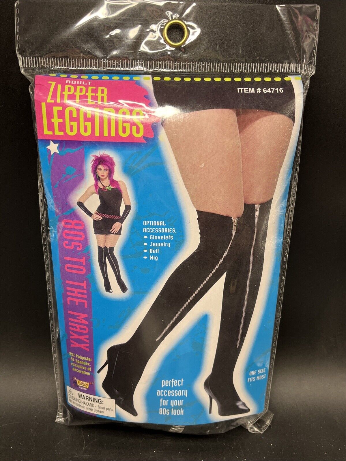These Adult Black Zipper Leggings are perfect for an 80s-themed Halloween accessory. Made of polyester with a touch of spandex for stretch, these leggings feature a zipper accent for added flair. The solid black color and one-size-fits-most size make them versatile for various occasions, from casual to formal parties. Perfect for women looking to add a touch of retro style to their Halloween ensemble.
