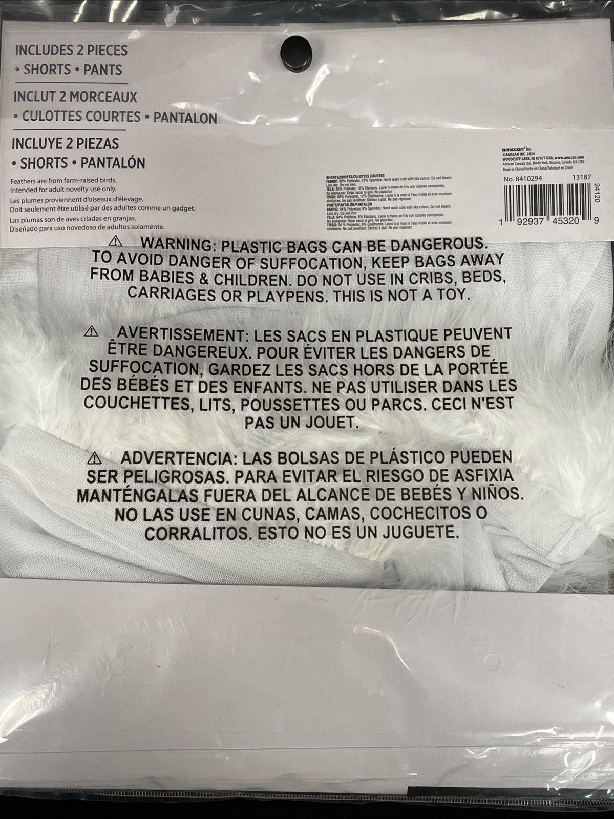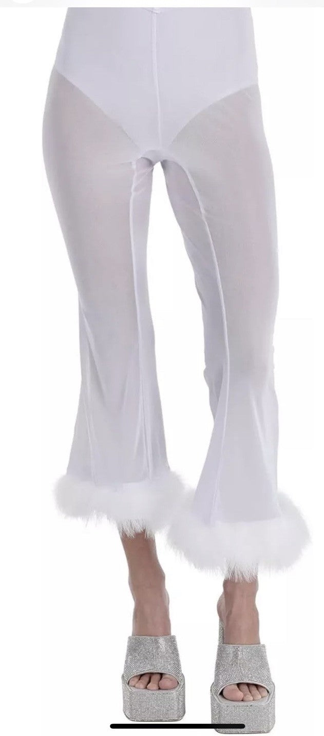 This Women's Sheer White Pants Feather Trim & White Briefs 2 Pieces Costume is a sexy and stylish outfit perfect for various occasions. The pants feature a cropped style with a solid white color and feather trim accents, adding a touch of elegance. Made from a blend of polyester and spandex, these pants offer a comfortable and flattering fit, with an elastic waist for added convenience. The set includes a white brief, making it a versatile and fun choice for those looking to make a statement. Hand wash only to maintain the quality of this eye-catching outfit.