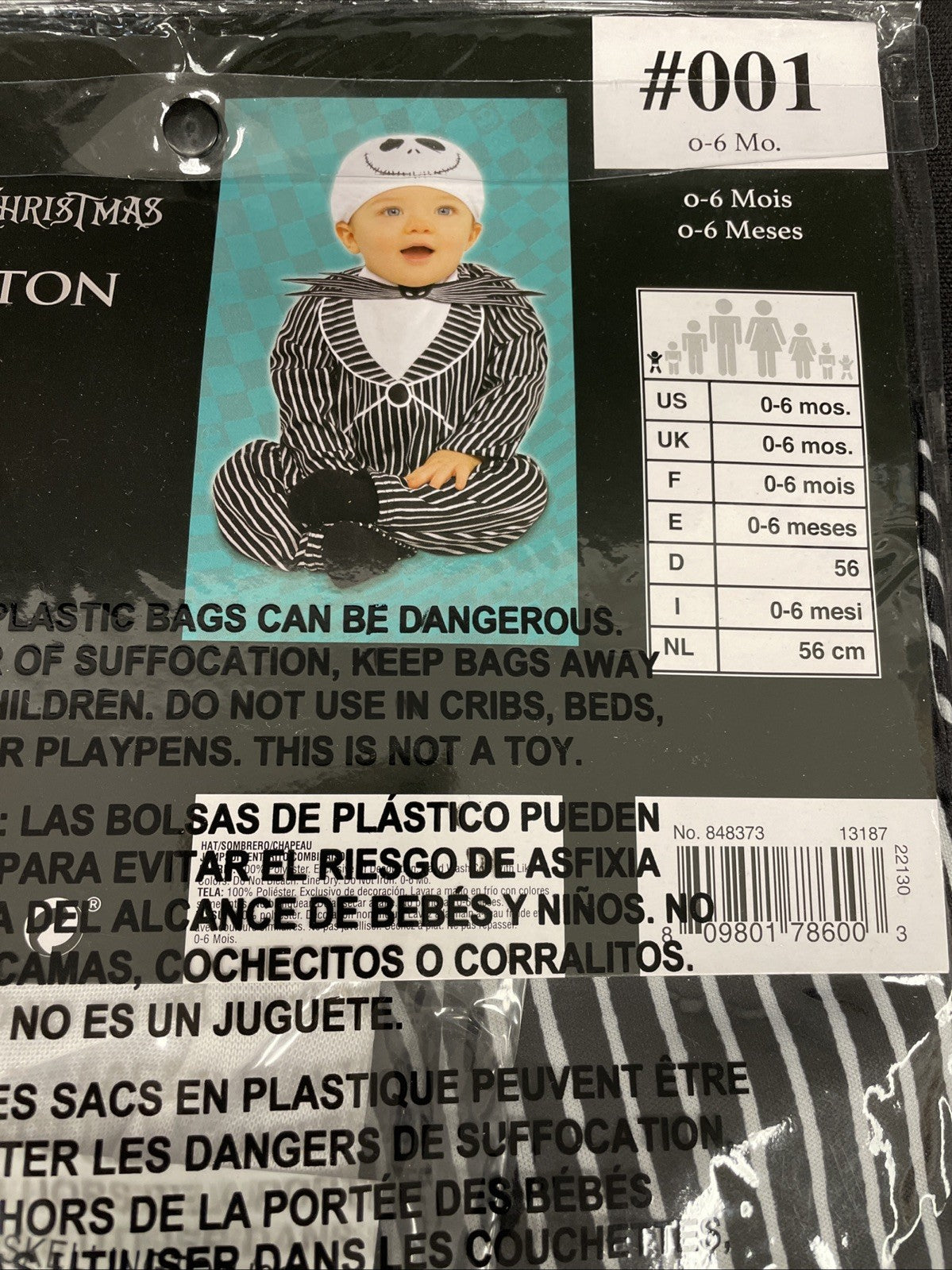 The Baby Jack Skellington Costume is a cute and cozy outfit for infants and toddlers, based on the beloved character from The Nightmare Before Christmas. This complete outfit from Amscan features a multi-color design with a Christmas theme, perfect for dressing up your little one for special occasions or Halloween. The size 0-6 months makes it suitable for very young children