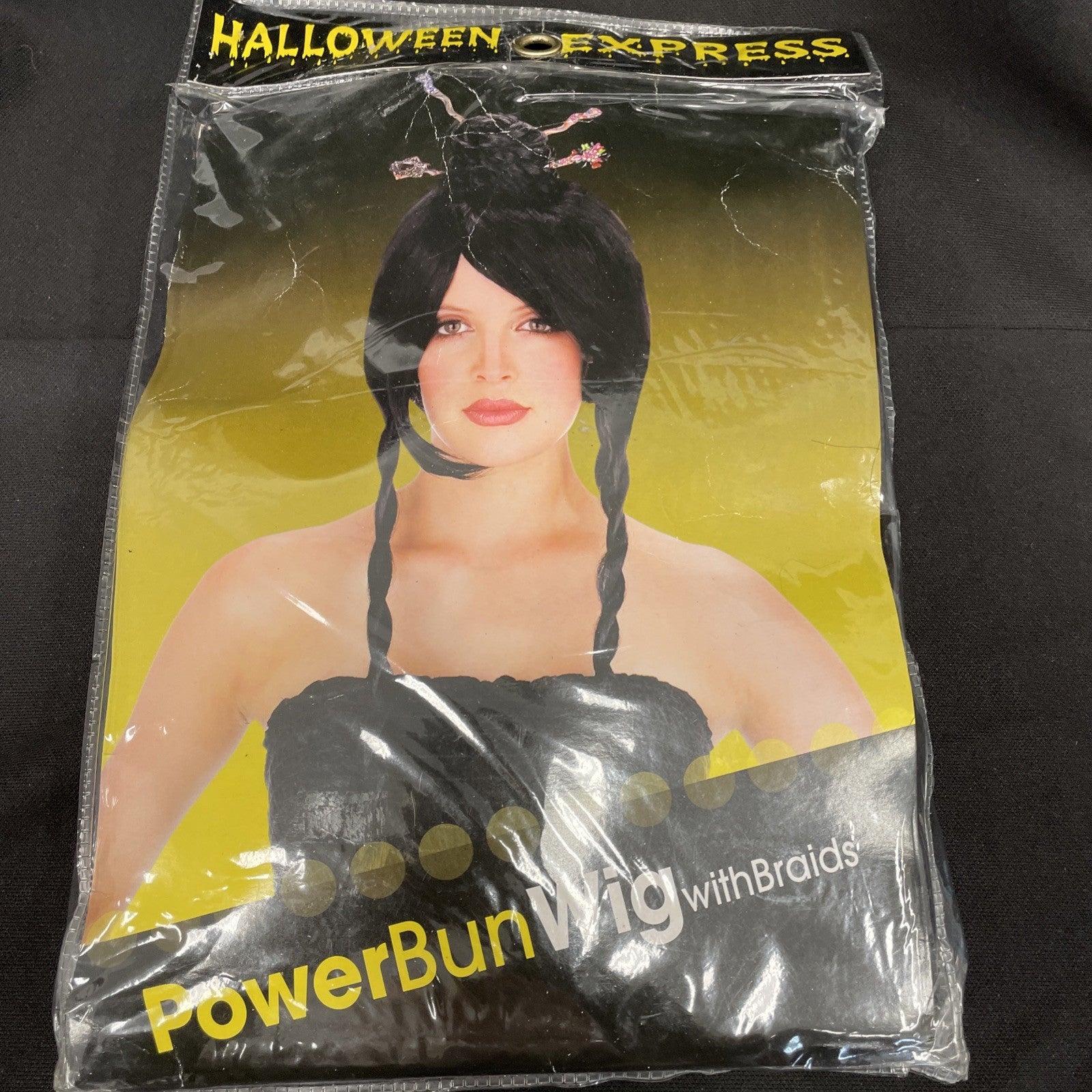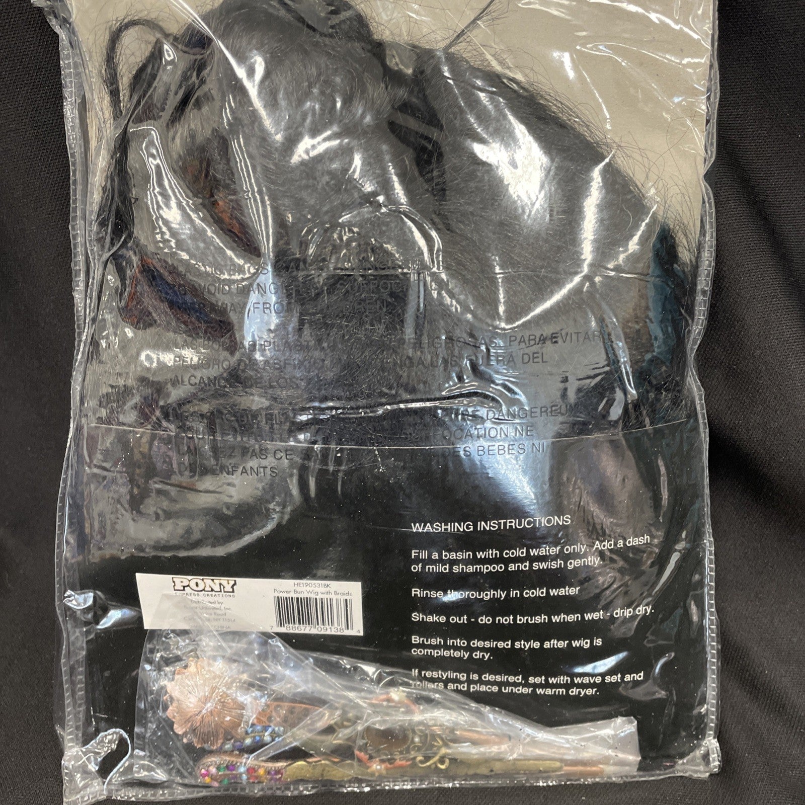 The Black Power Bun with Braids Adult Halloween Accessory is a fun and fashionable addition to a variety of costumes. Other accessories, such as colorful hairpins (not included), can be placed in the bun. This Halloween costume wig is available in one size that fits most adult wearers and is made of nylon.