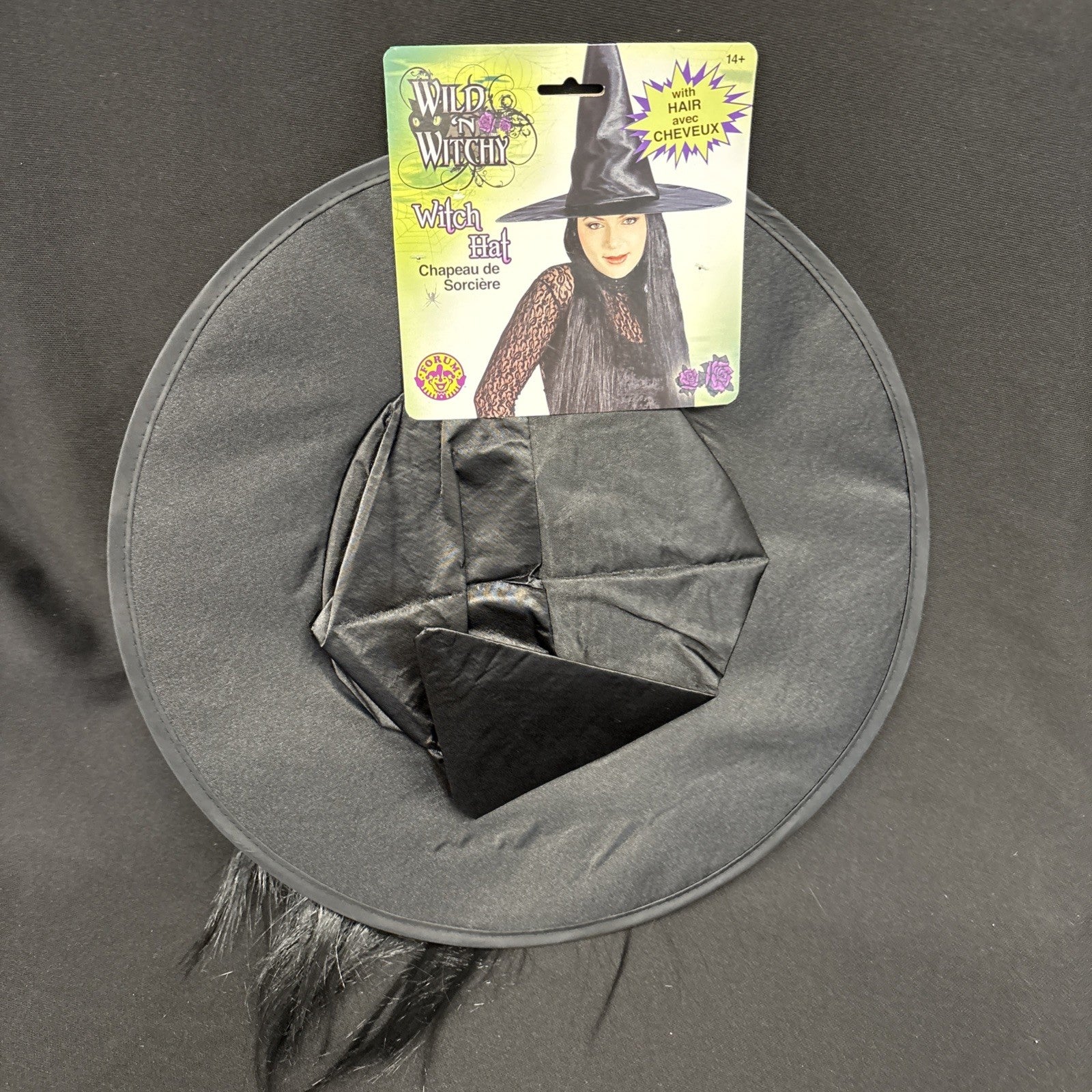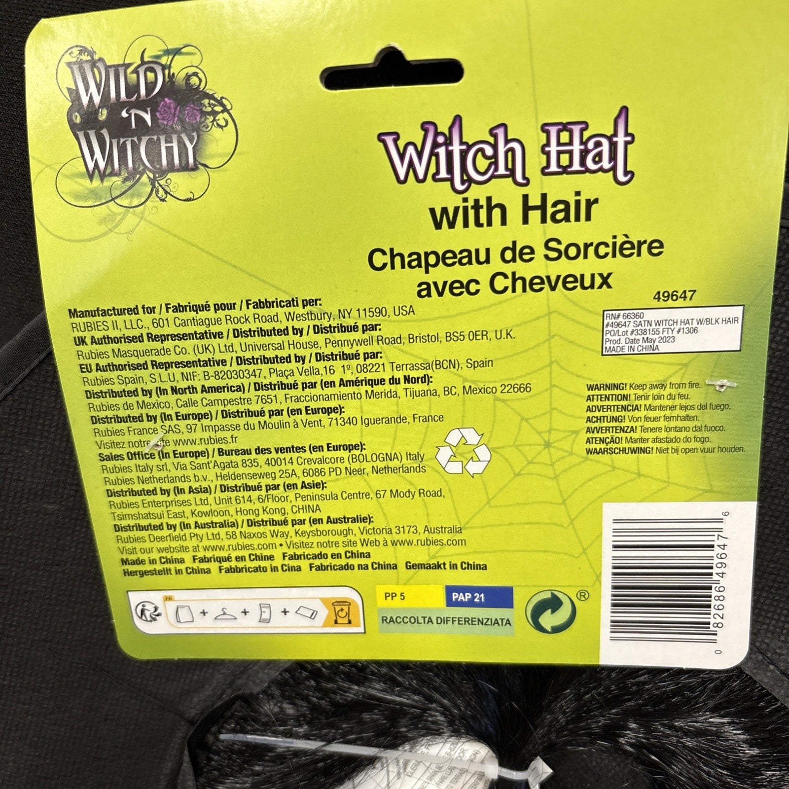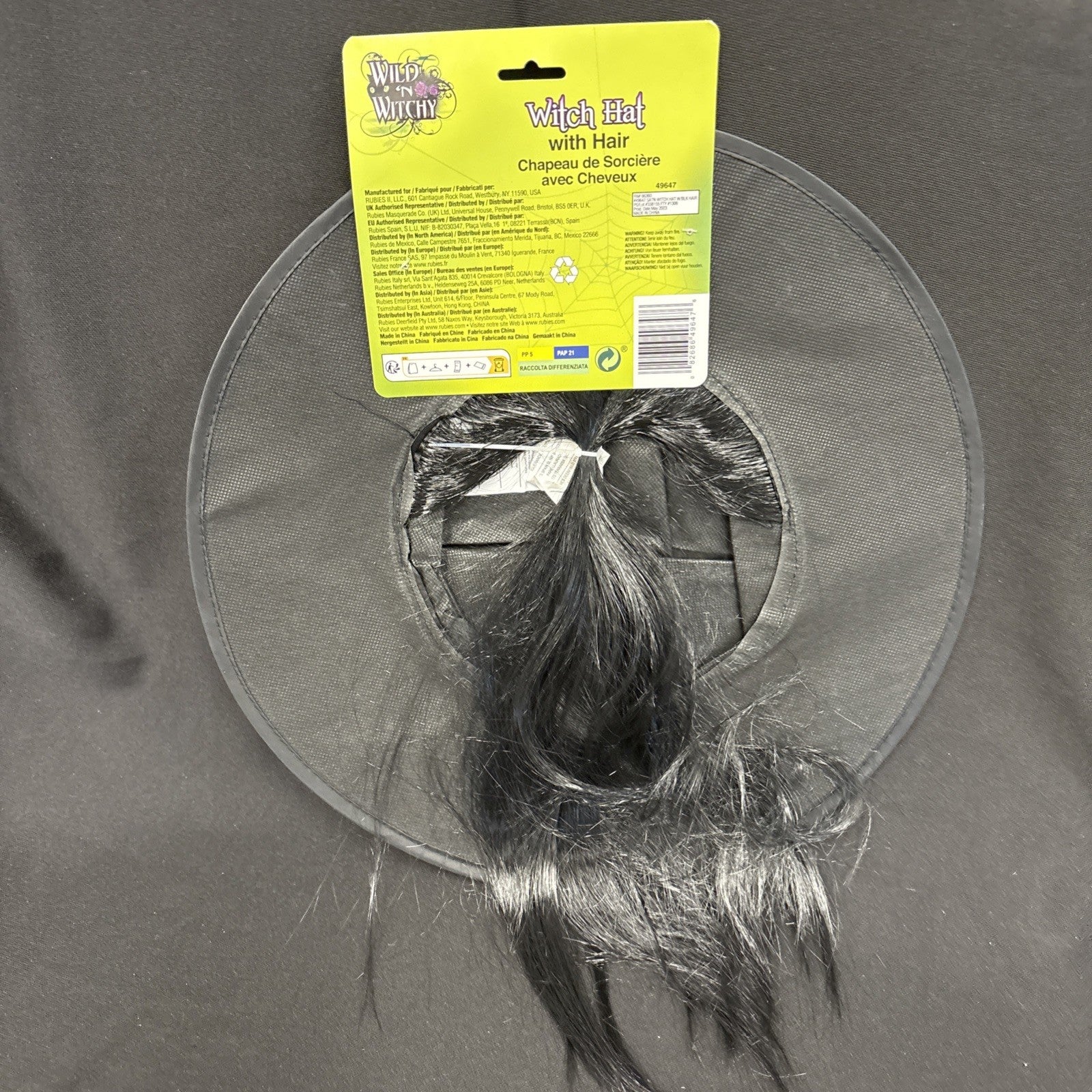 The Black Witch Hat with Hair by Rubies is a perfect accessory for Halloween or themed events. This one-size-fits-all hat is made of durable polyester material and features a classic black color, along with the iconic witch theme. It is a stylish and fun addition to any costume, adding a touch of whimsy and mystery to your outfit. Perfect for those looking to channel their inner witch or add a touch of magic to their look.