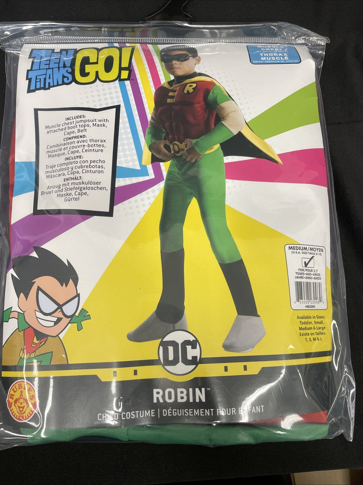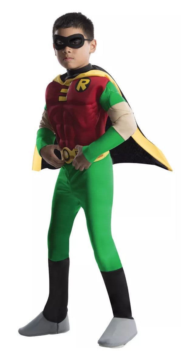 The product is a Brand New Deluxe Muscle Chest Robin Batman costume in size Medium for boys. It features a red and green superhero design, made of polyester material. Suitable for kids participating in school plays or dress-up parties, this complete costume is perfect for young boys to emulate their favorite superhero character, Robin, from Teen Titans Go! or Batman.
