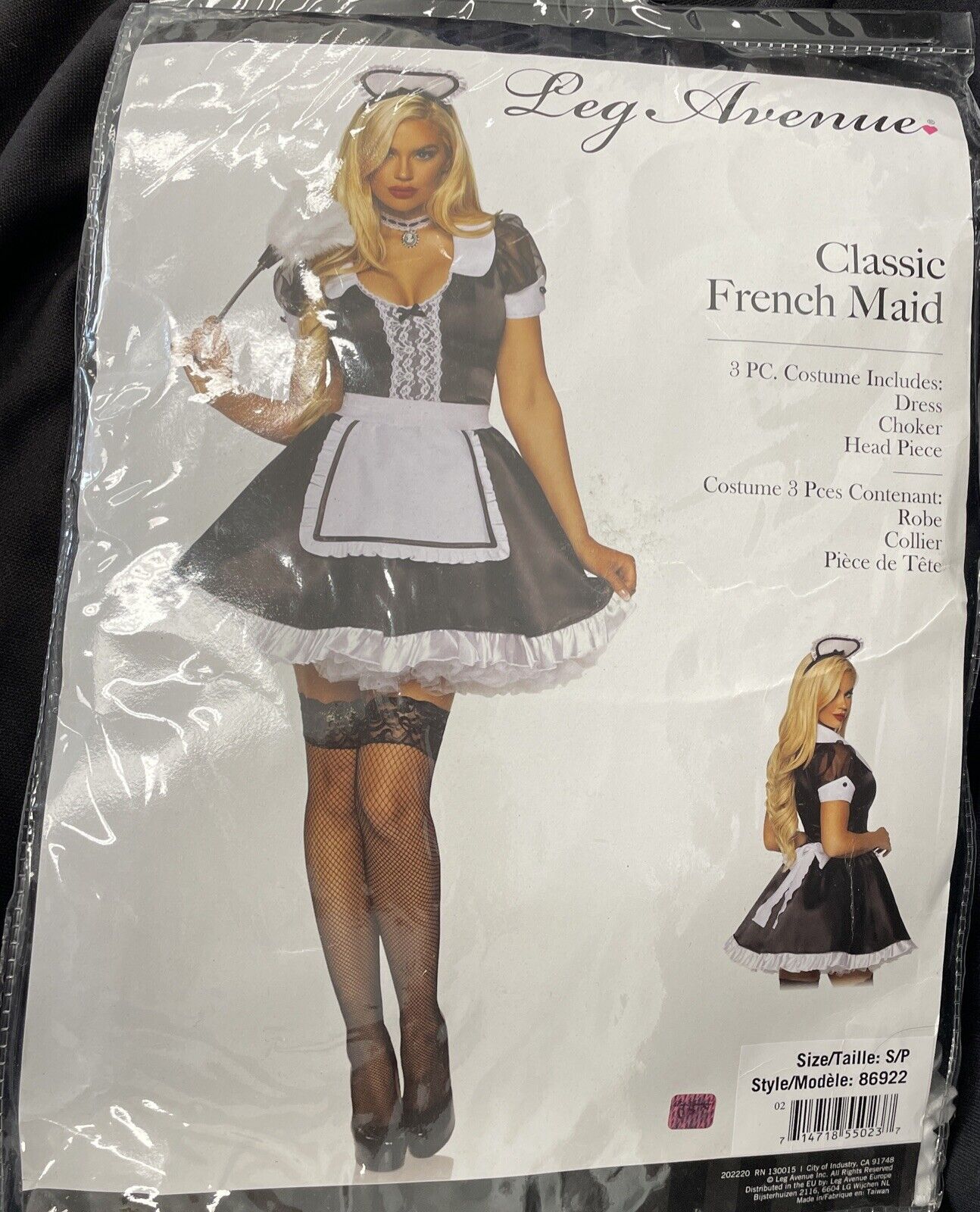 This classic French maid costume is perfect for Halloween or any fancy dress occasion. It includes a beautiful multi-colored dress with a choker and headpiece, all made by Leg Avenue, Inc. The outfit is designed for women and comes in size small.