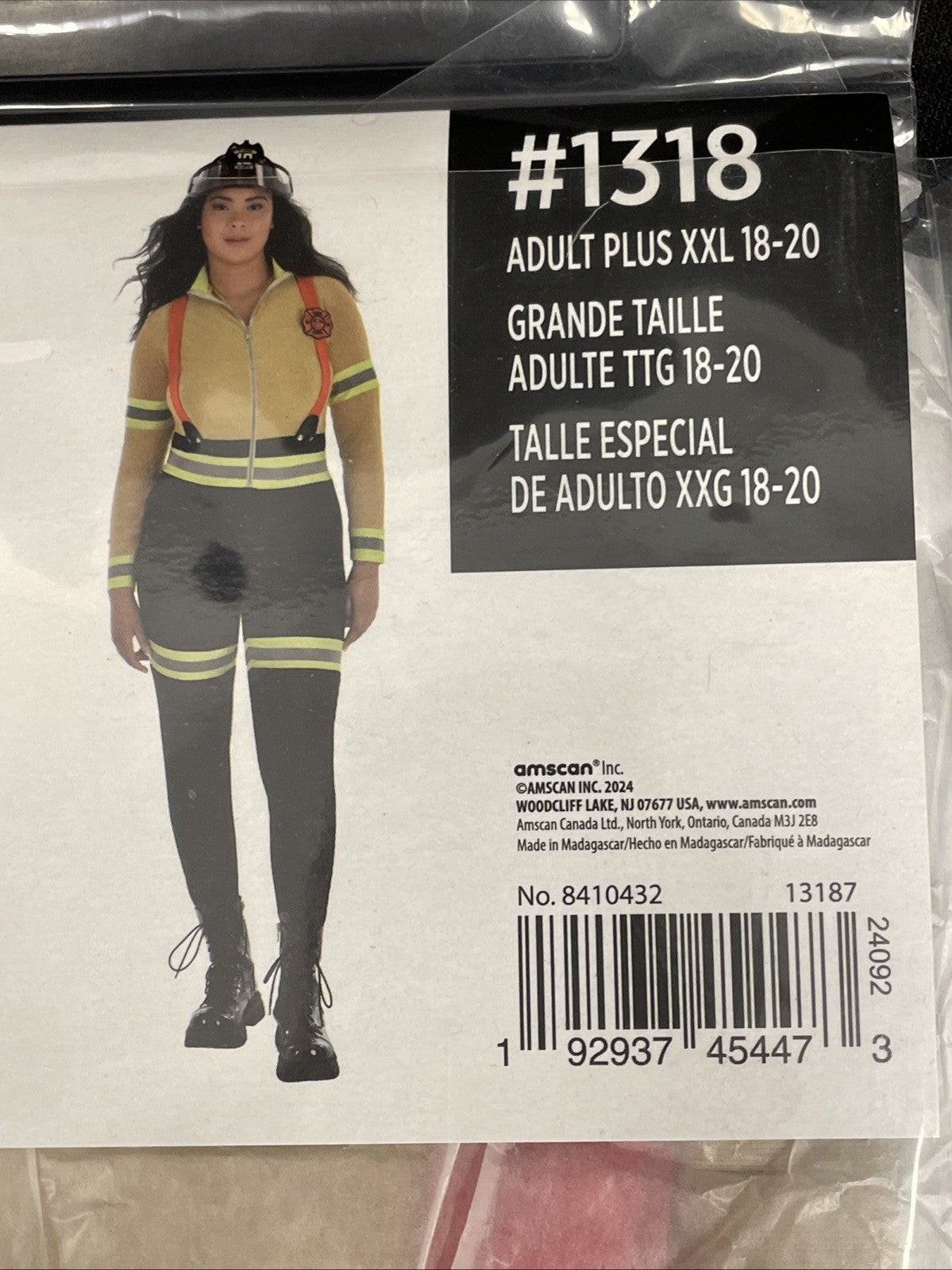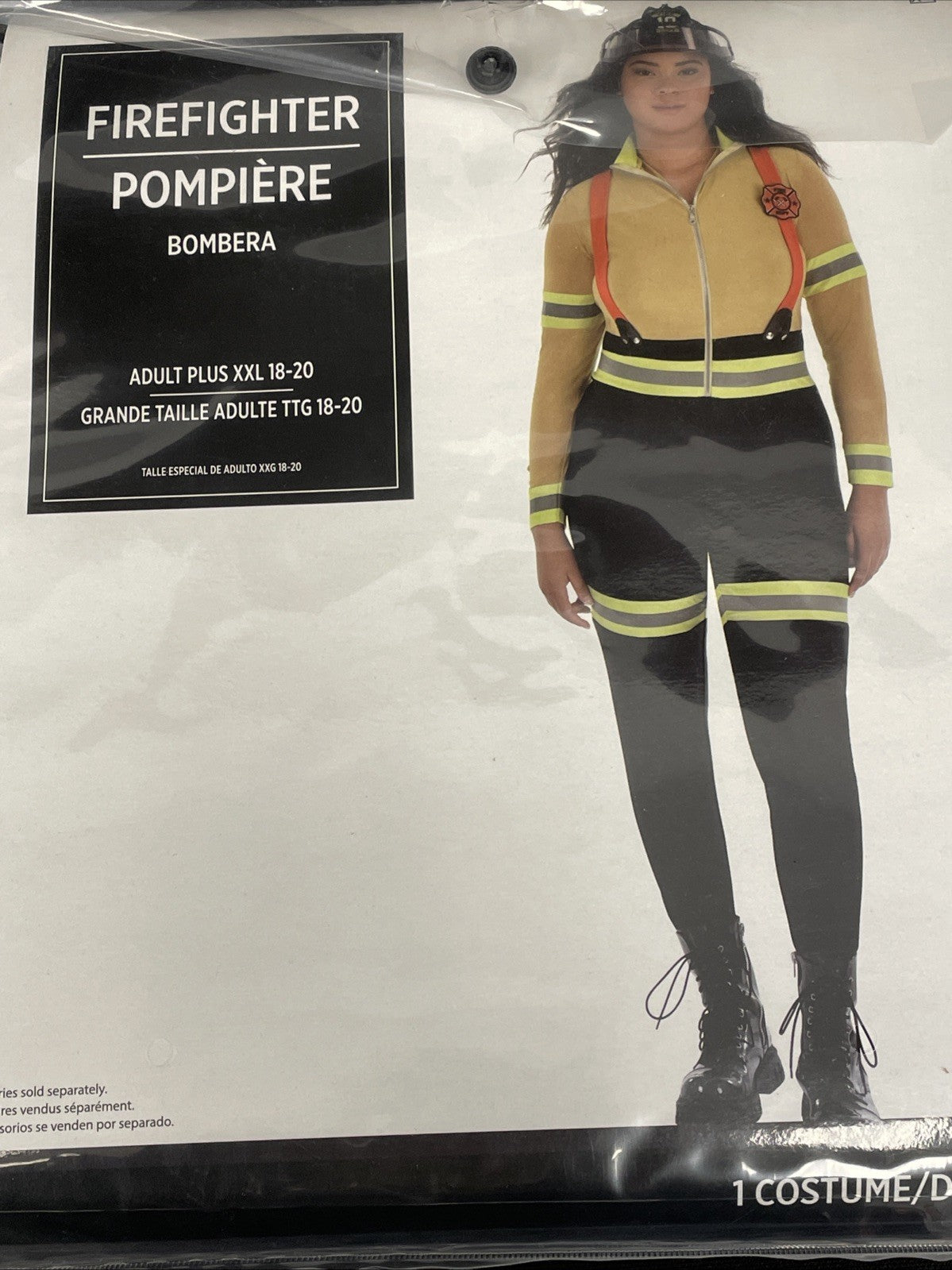 This product is an InCharacter adult plus XXL 18-20 female firefighter costume. The outfit is designed in a multi-color scheme and is a complete ensemble, perfect for those looking to dress up for a themed event or role-playing session. The costume captures the essence of a firefighter, making it a unique and eye-catching choice for those interested in occupations-themed outfits.