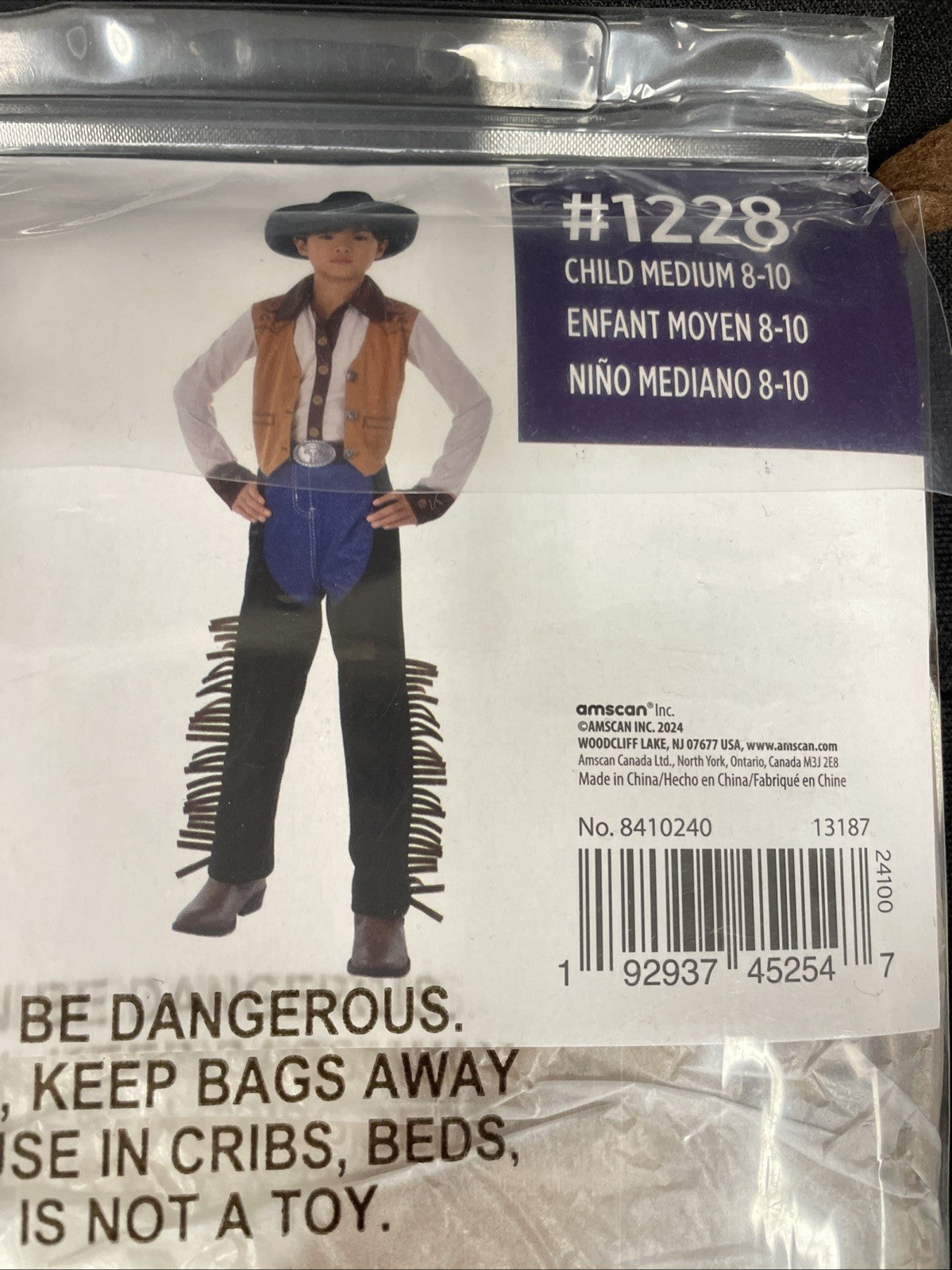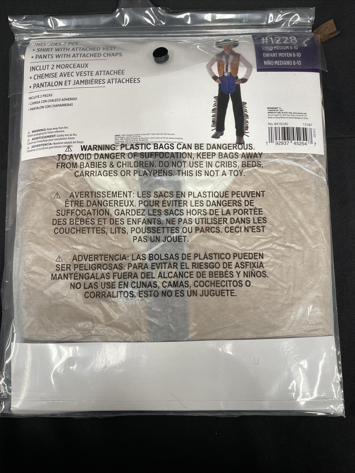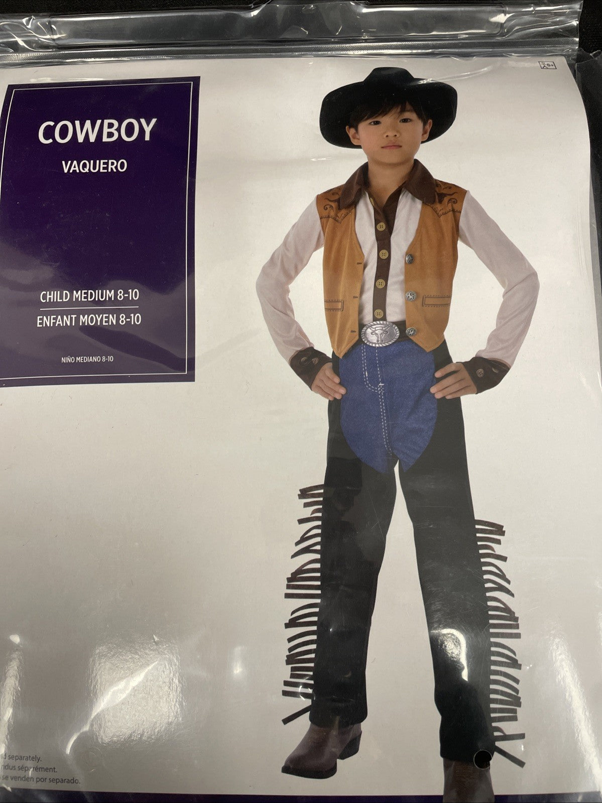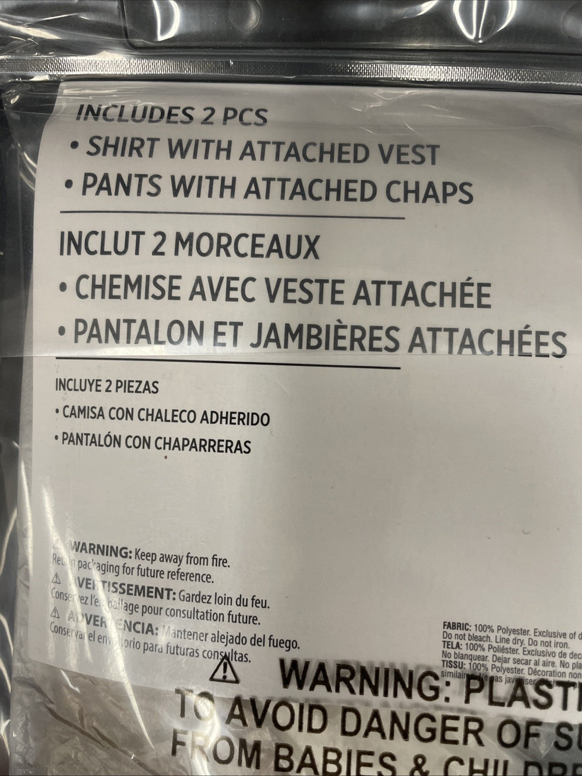 Includes shirt with attached vest , pants with attached chaps