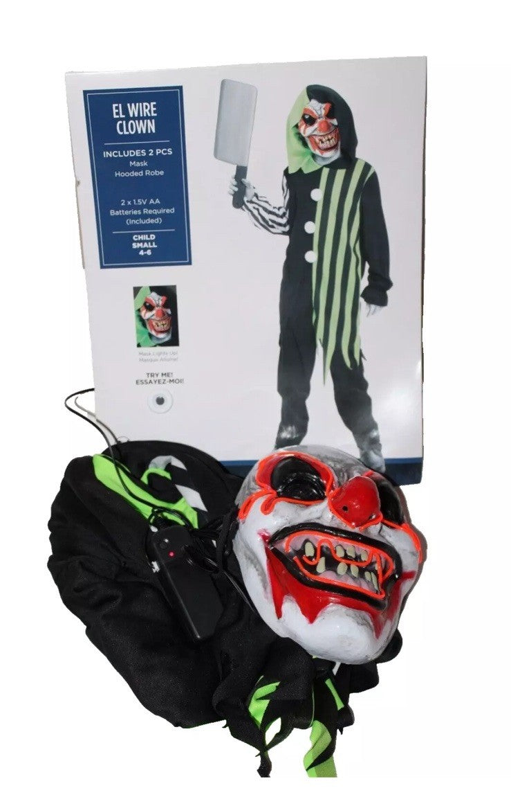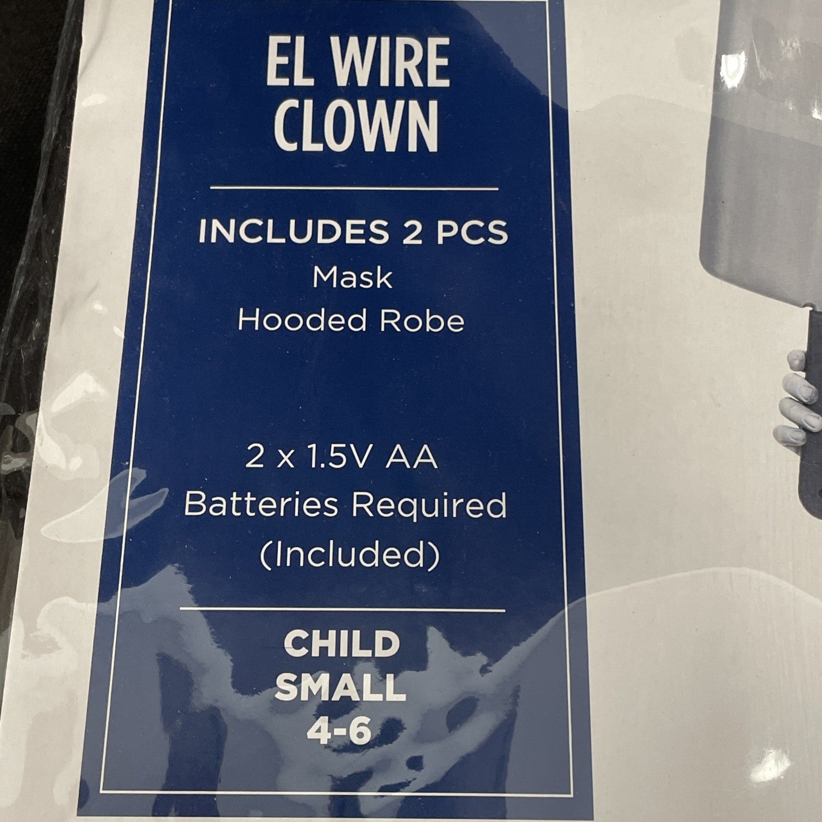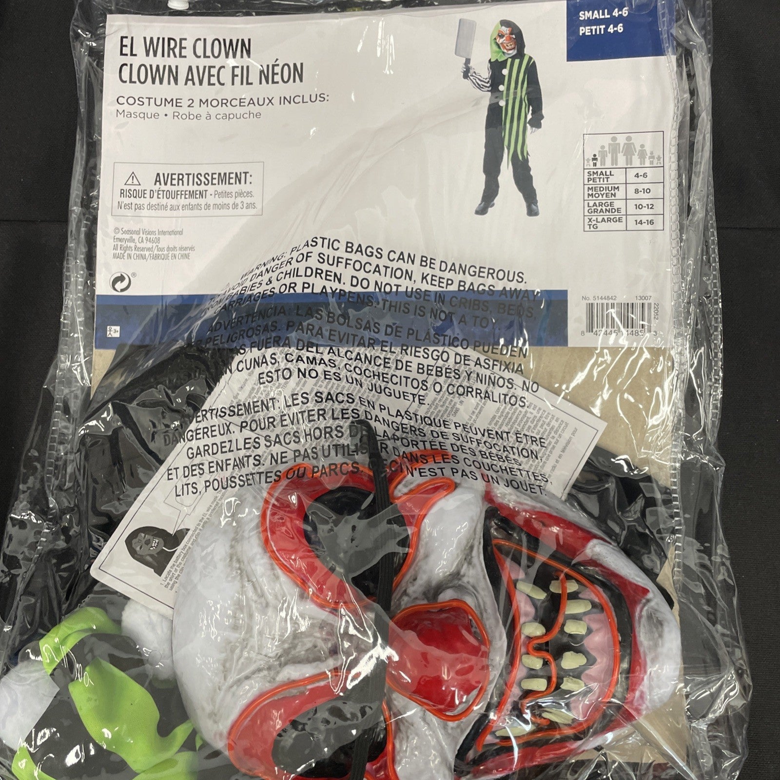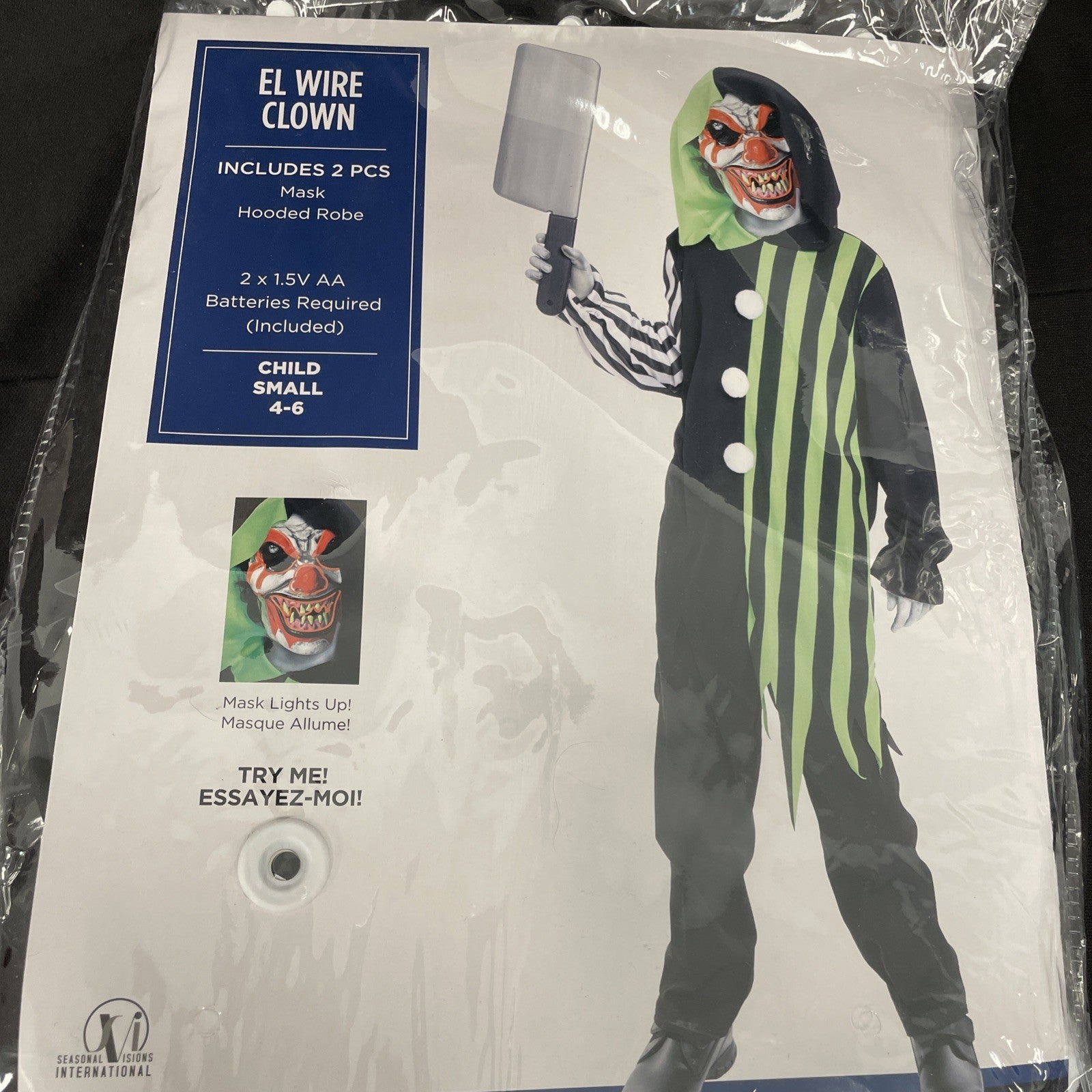 The El Wire Clown Green Black Child Halloween Costume in size small (4-6) is a fun and playful outfit perfect for young boys dressing up for Halloween. Made of polyester material, this complete outfit features a black color with green accents, adding a unique twist to the traditional clown costume. The bright el wire lights up the costume, making it a stand-out choice for any Halloween celebration or costume party.