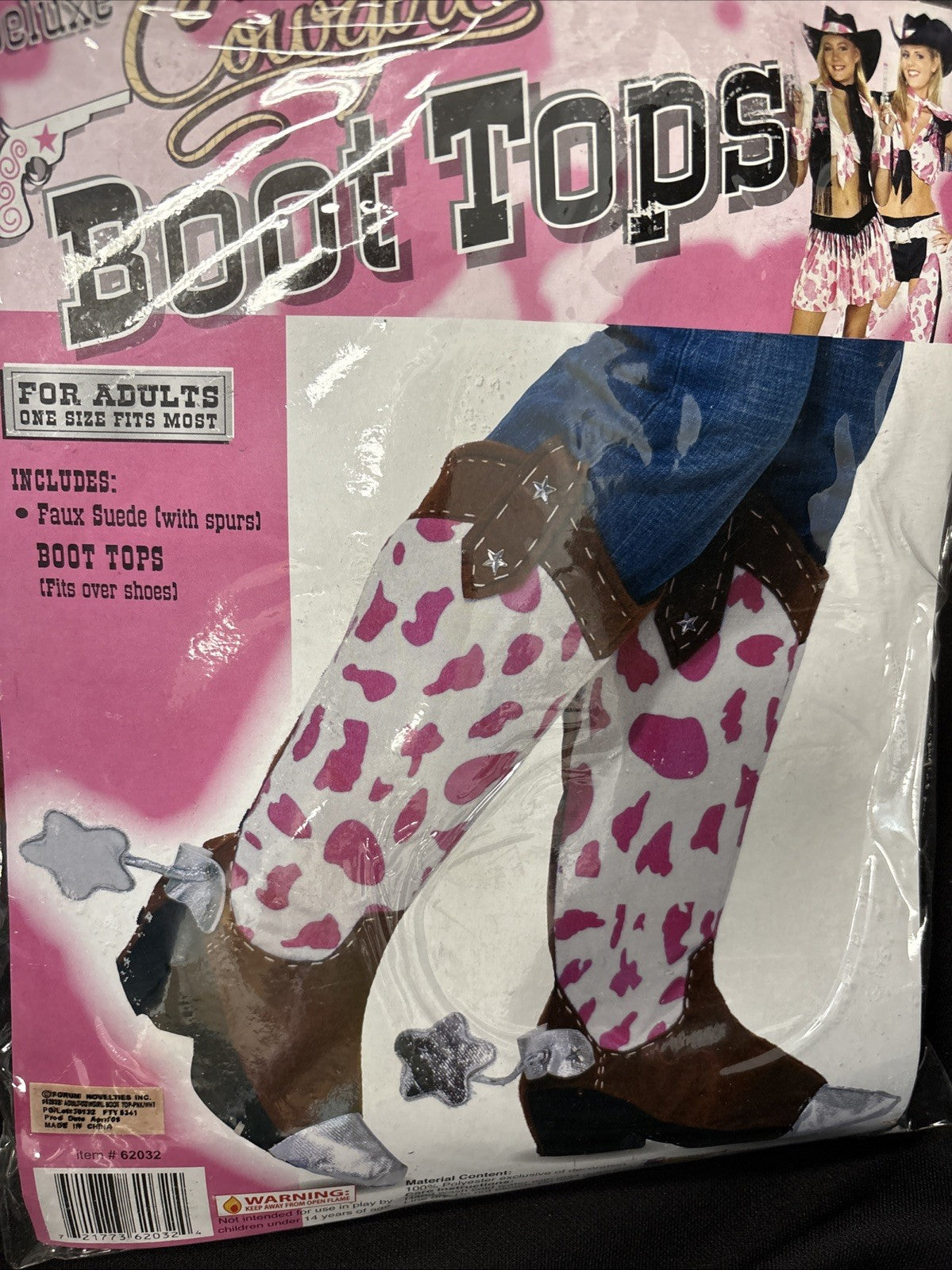 The Adult-cowgirl Boot Top is a fun and stylish accessory that adds a touch of cowgirl flair to any outfit. This pink and white boot top features a cowgirl theme and is designed to fit most adult sizes. Perfect for those looking to add a playful and unique element to their wardrobe, this boot top is sure to stand out and make a statement.
