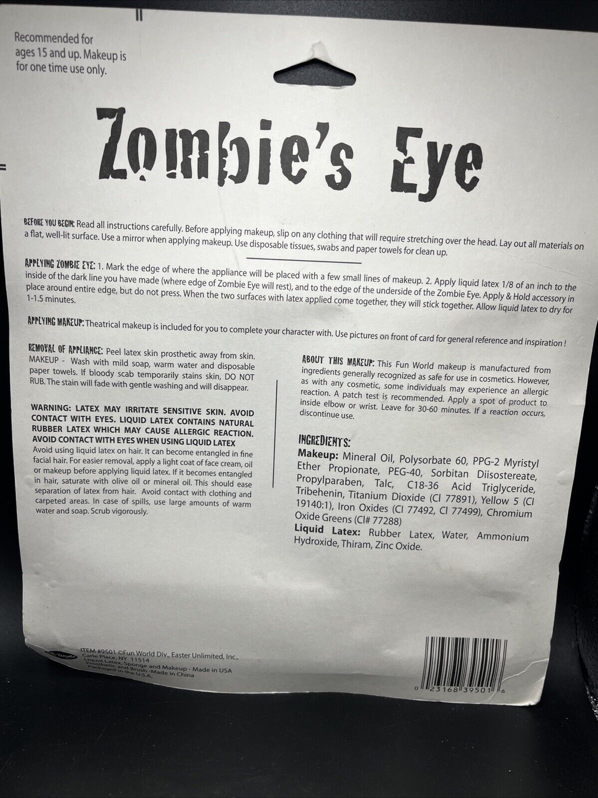 The Halloween Zombie's Latex Eye Costume Makeup Accessory by Fun World is a face paint palette designed to transform your face into a spooky zombie look. The palette includes red, white, and black paint, perfect for creating a gruesome and realistic Halloween costume. This unisex product is one size fits all and is ideal for adults looking to personalize their Halloween theme with a zombie makeup design. Made in China, this makeup accessory is a fun and easy way to add a Halloween touch to your costume.