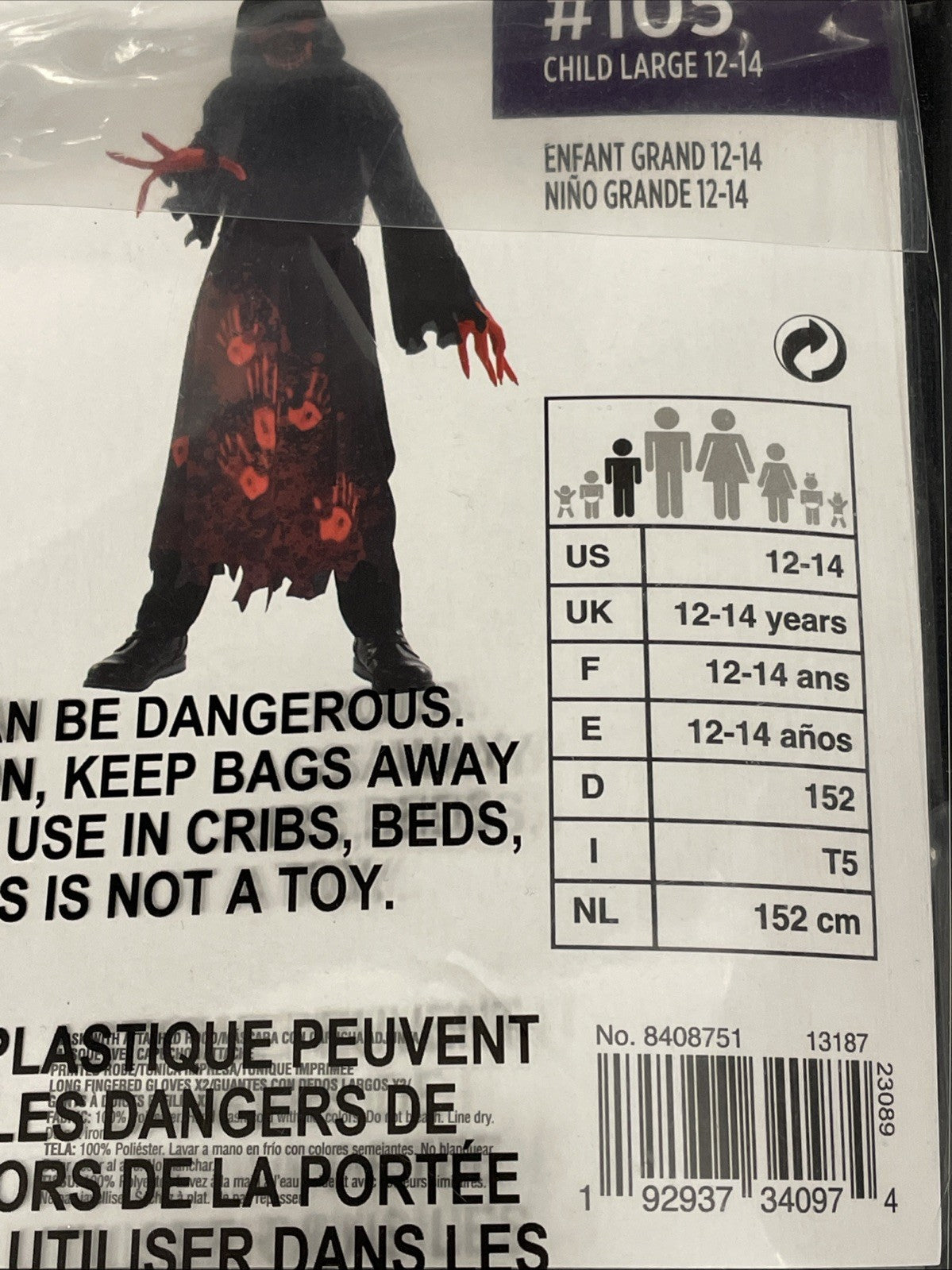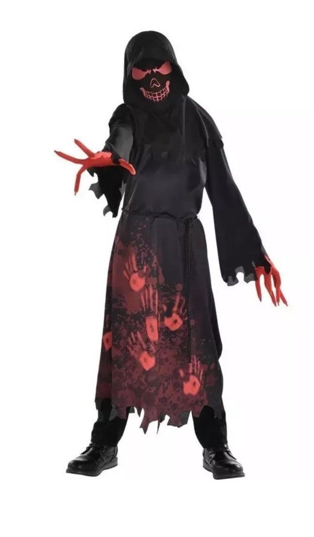 The Hooded Horror Glow in the Dark Mask is a large sized black Halloween costume. Made of polyester and featuring a glowing mask, this Amscan product is perfect for adding a spooky touch to any Halloween ensemble. The mask's eerie design and glowing feature are sure to make it a standout piece for any Halloween celebration or costume party. Perfect for boys looking to make a statement with their Halloween attire, this unique costume is sure to delight and entertain.