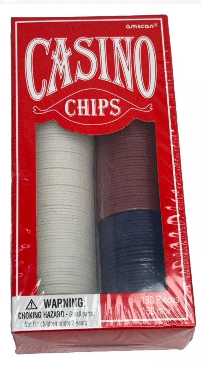 Add some excitement to your poker night with these brand new, sealed box of 150 poker chips from Amscan. The chips feature a colored design with ridged edges and are made of durable plastic. Each chip measures 3.5cm in size and comes in a retail sealed packaging box.