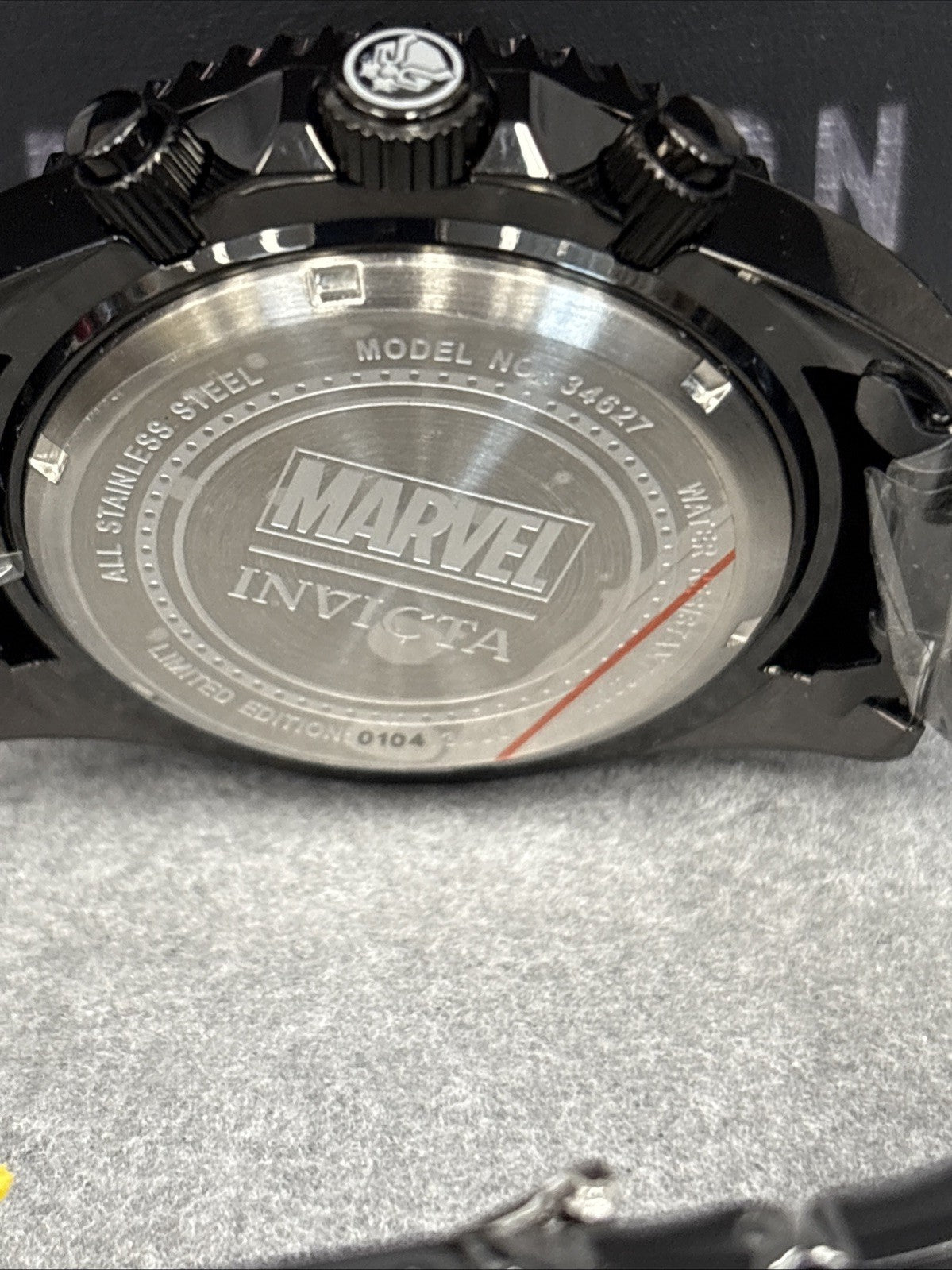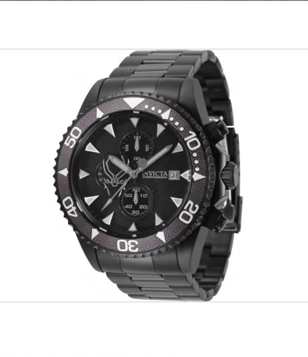 Black (Black Panther) dial enhanced by luminous black hands. Black-plated stainless steel case with a black-plated stainless steel band. Quartz movement. 200 meters / 660 feet water resistance. Uni-directional Rotating bezel. Flame Fusion crystal. Solid caseback. Deployment clasp. Pull / Push crown. Case size 47 mm. Band 24 mm x 8.5 incheslong. Invicta 34627 Marvel Black Panther Watch.