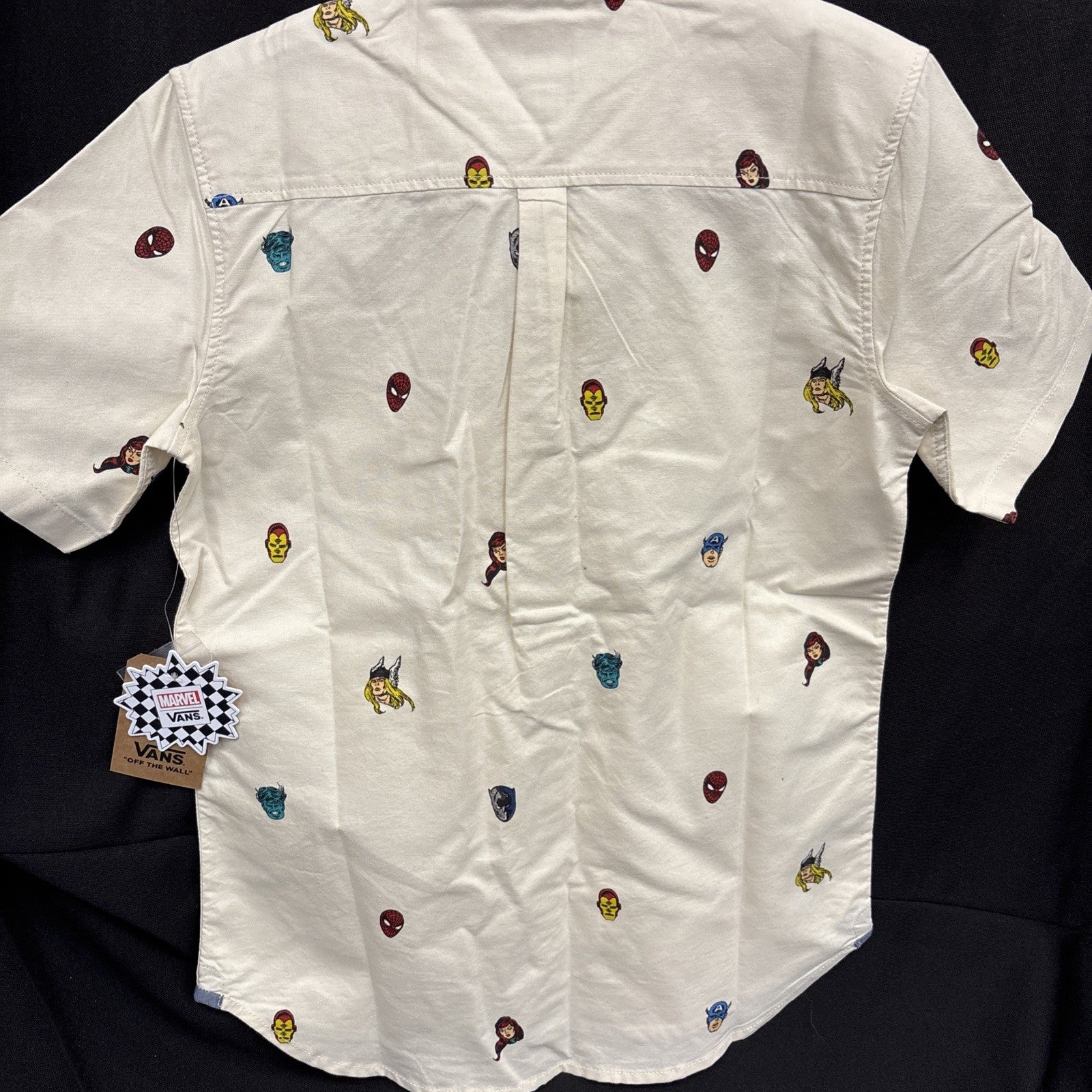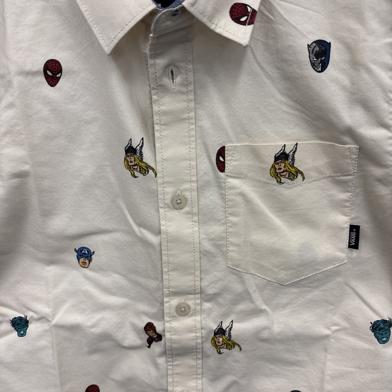 Classic skate style and iconic superheroes join forces in a collaboration that's as epic as the adventures of the Avengers. This short-sleeve woven shirt serves as a tribute to his favorite heroes with a comic-inspired allover print. Style Name: Vans X Marvel Avengers Woven Shirt (Big Boys).