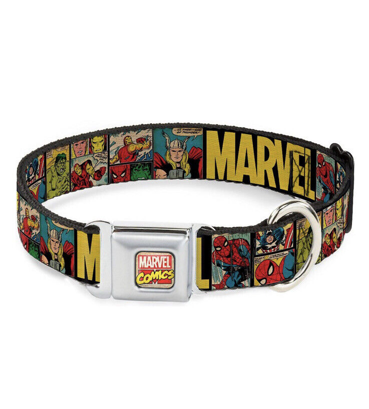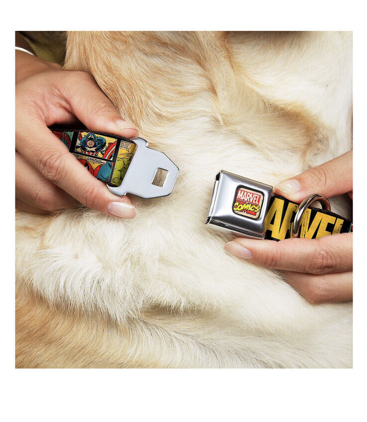 Your dog will be the talk of the town when people notice they're wearing this awesome SeatBelt Dog Collar! Made from high-density polyester and durable steel components, this collar is built to last. It features beautiful vibrant artwork. The buckle is a miniature authentic SeatBelt Buckle, so you press the center button to release the clasp. This product is Made in USA by Buckle-Down, Inc. and is officially licensed by Marvel Comics.