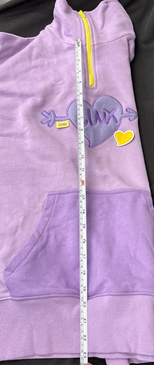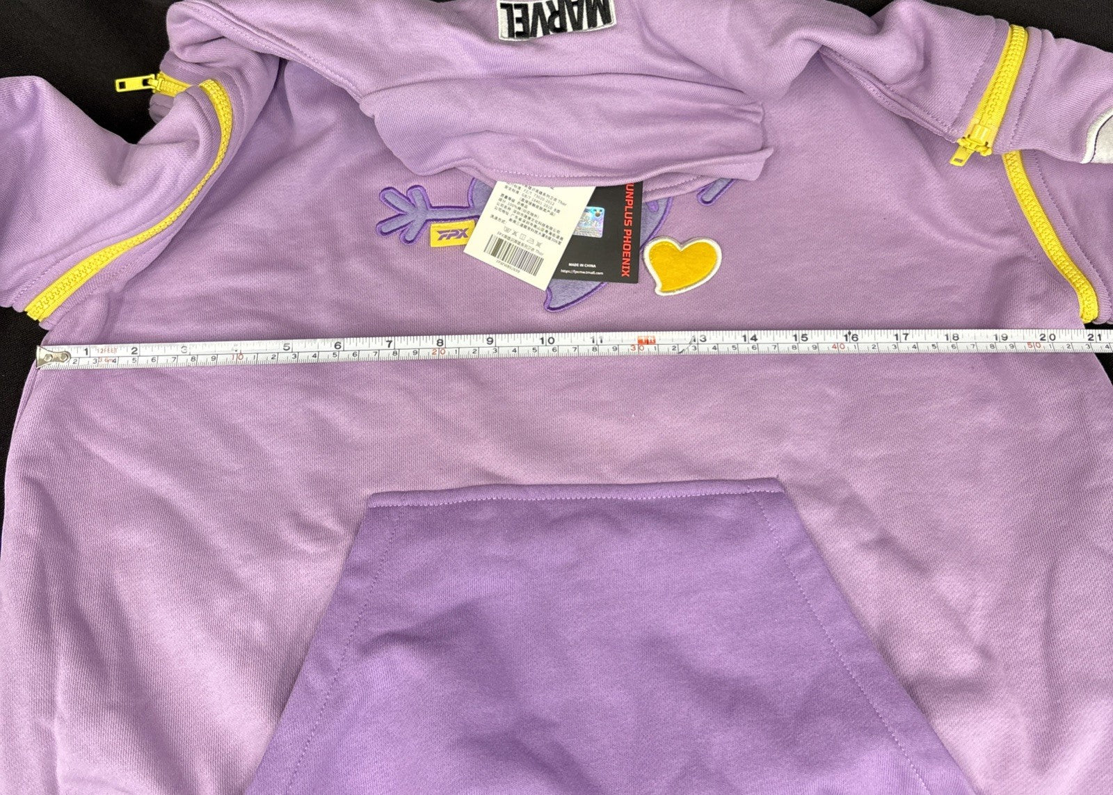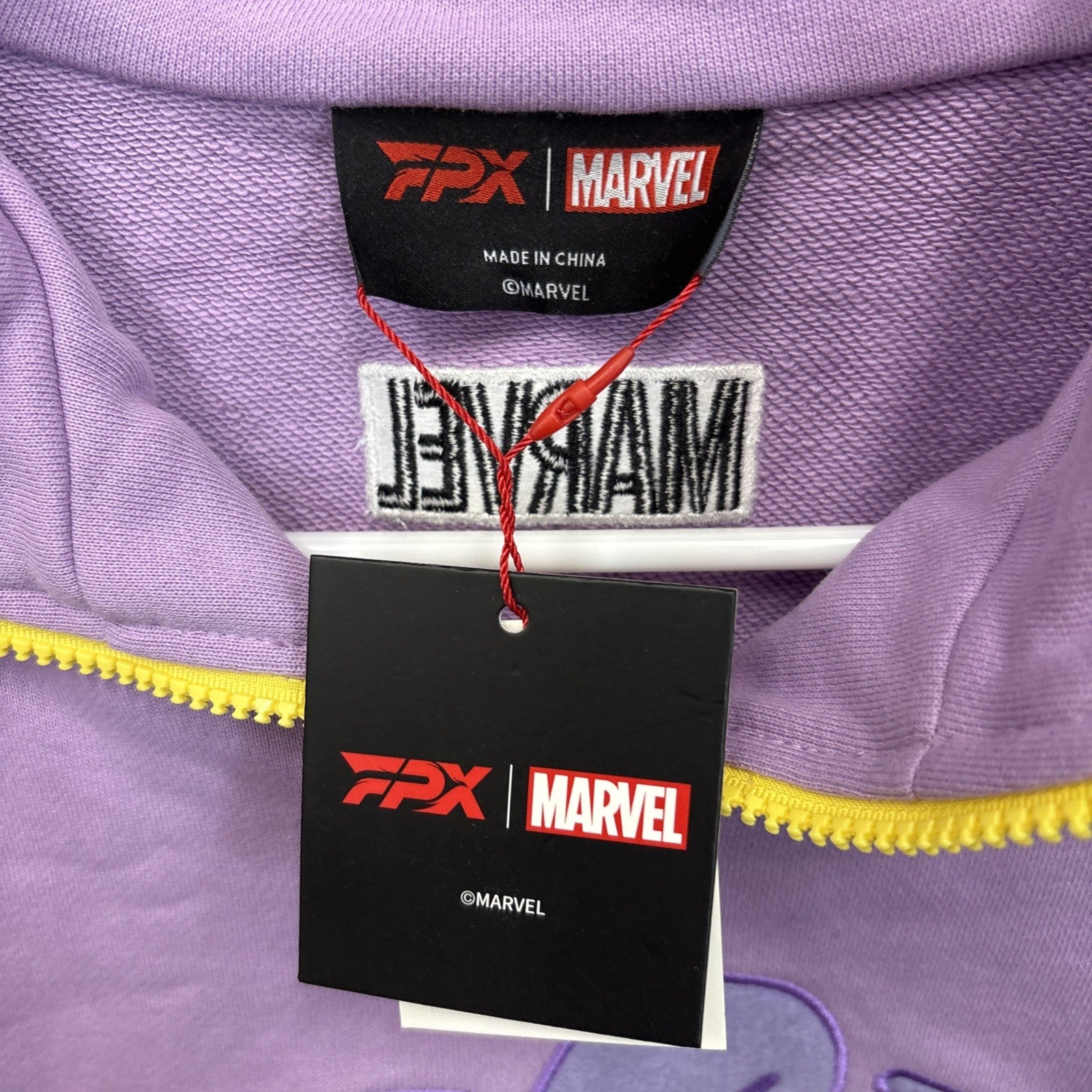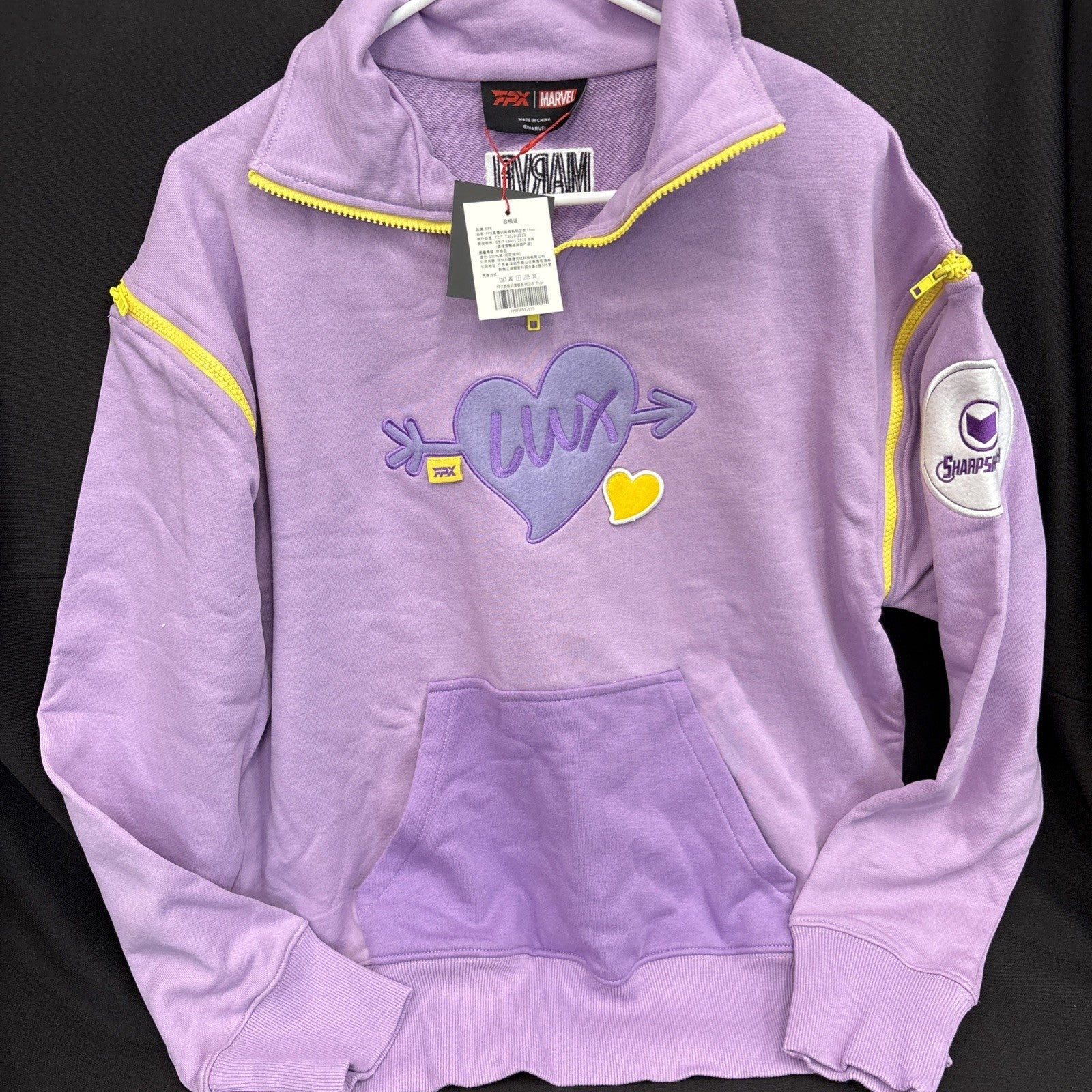 The FPX Marvel Hawkeye Graphic & Embroidered Lavender Heather 1/4 Zip Sweatshirt is a stylish and comfortable activewear piece for women This sweatshirt features a purple color with embroidered accents, adding a touch of sophistication to the design. The 1/4 zip feature allows for easy wear front pouch pocket and removable sleeves that can zip on and off.