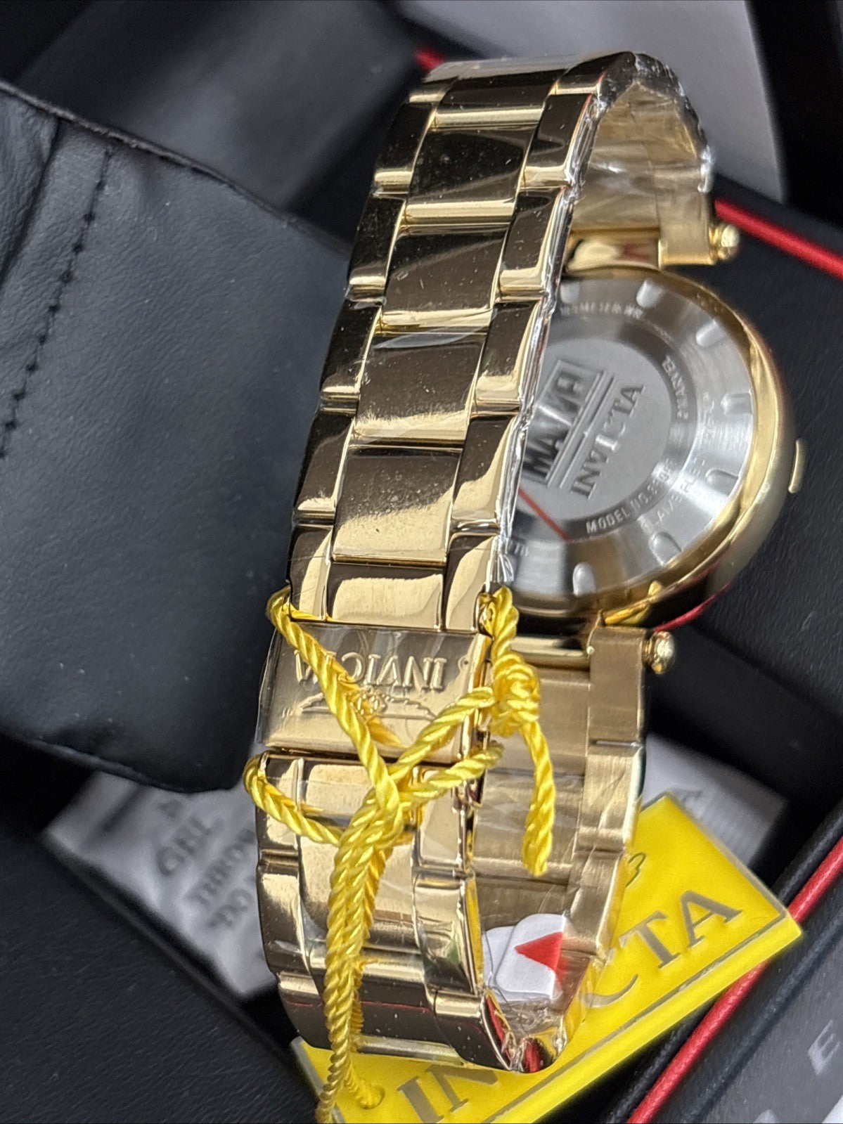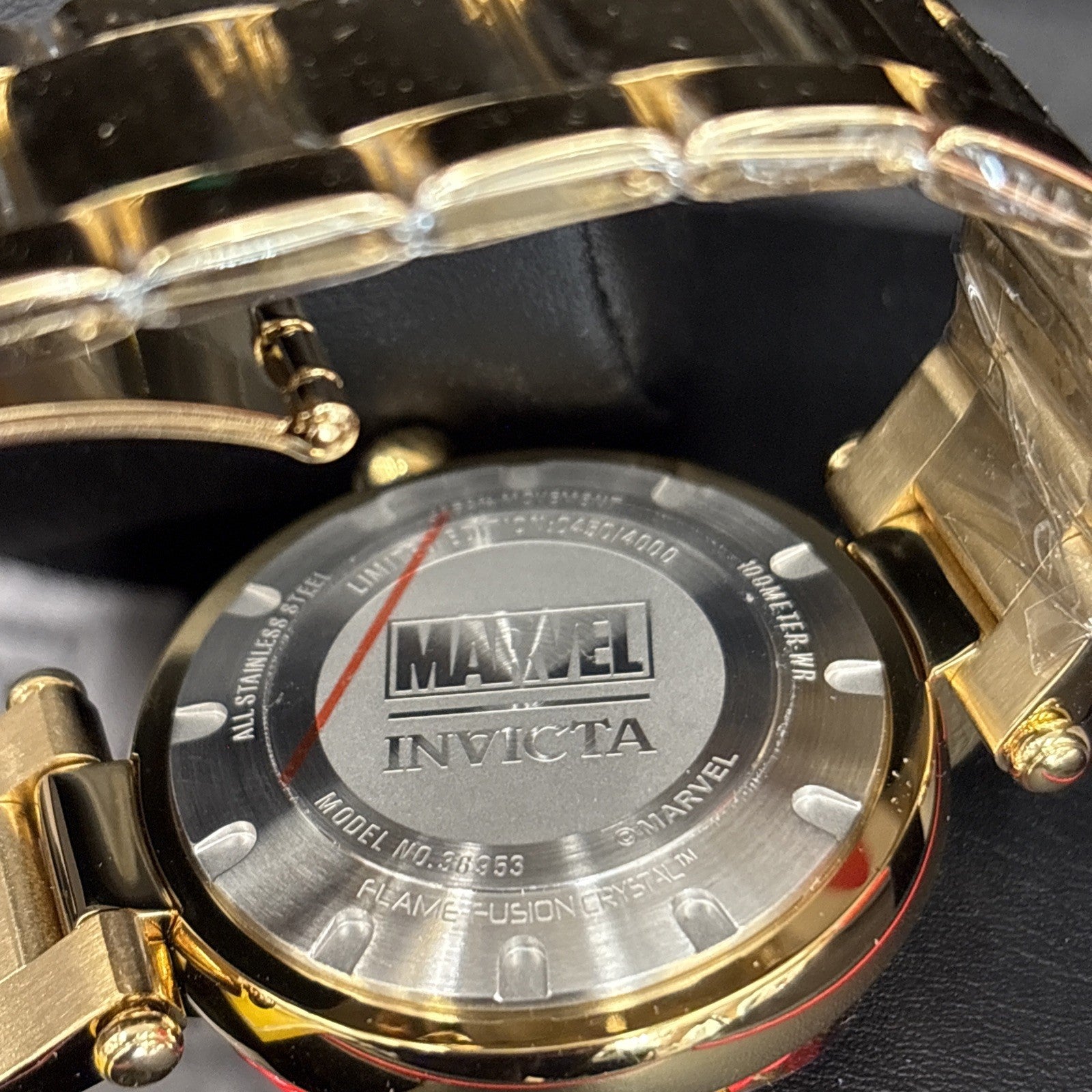 The Invicta Captain Marvel Women's 40mm Limited Edition Crystals Dial Watch 36953 is a luxurious timepiece featuring a red, gold, and yellow bezel with non-numeric hour marks and round indexes. This stylish watch comes with a bracelet band, a gold and yellow case with a screwback caseback, and a quartz movement. With water resistance up to 100m (10 ATM) and scratch-resistant sapphire crystal, this limited edition watch is perfect for any woman looking for a combination of elegance and functionality in her wristwear. The watch also comes with original packaging and papers, making it a great choice for any Marvel fan or watch enthusiast.