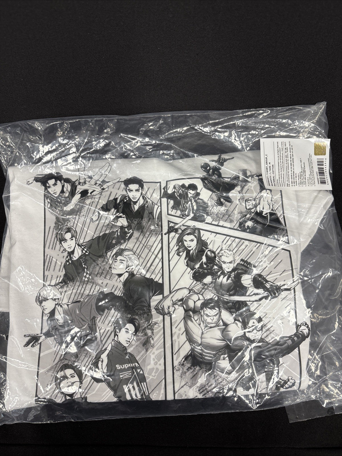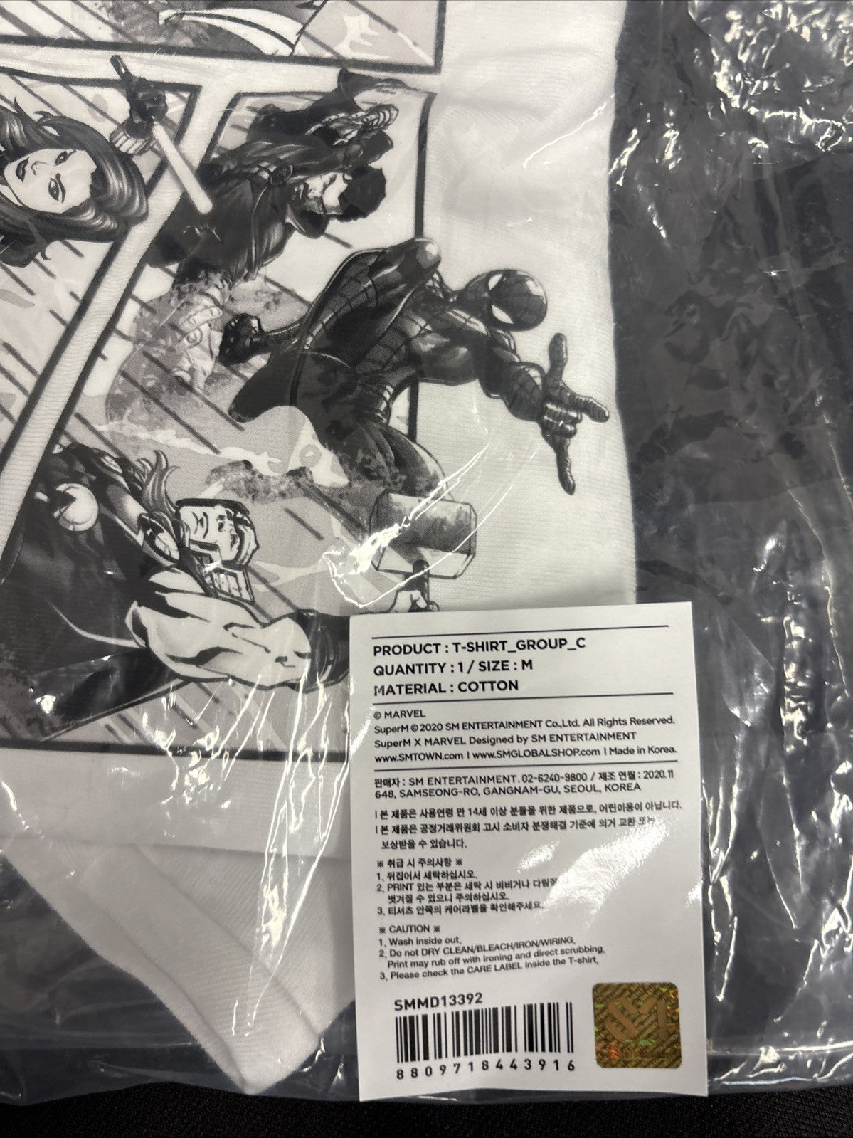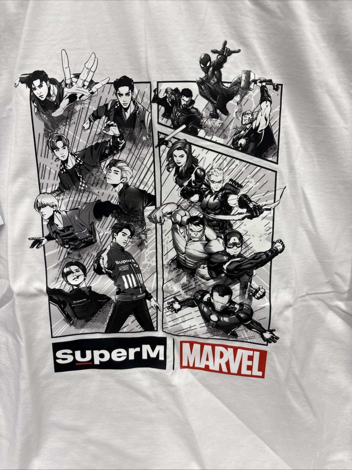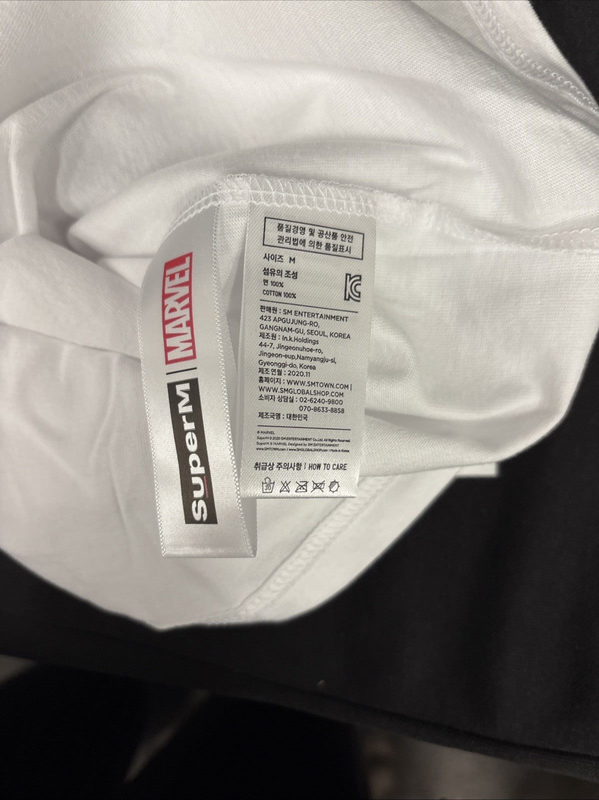 The product is a men's Marvel Super M graphic t-shirt in black and white. Made from cotton, this regular fit shirt features a short sleeve design with the theme of Super M. Perfect for fans of Marvel comics and superheroes, this t-shirt is medium in size and offers a stylish and comfortable option for casual wear.