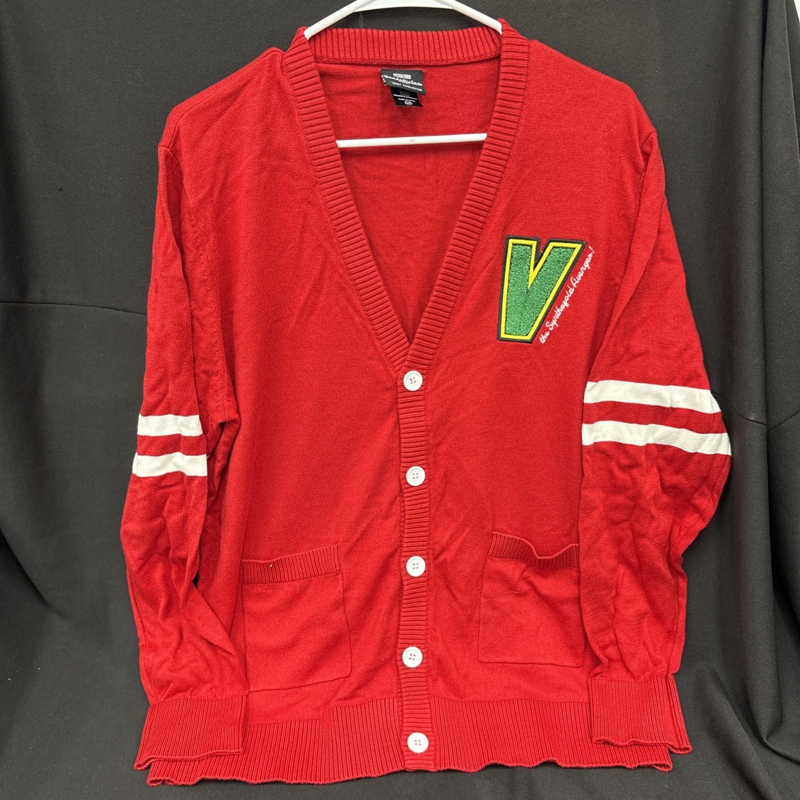 Dress in retro style with this cardigan inspired by the Synthezoid Avenger, Vision! The star of Marvel's WandaVision inspired the letterman patch on the chest of this varsity cardigan from Our Universe.