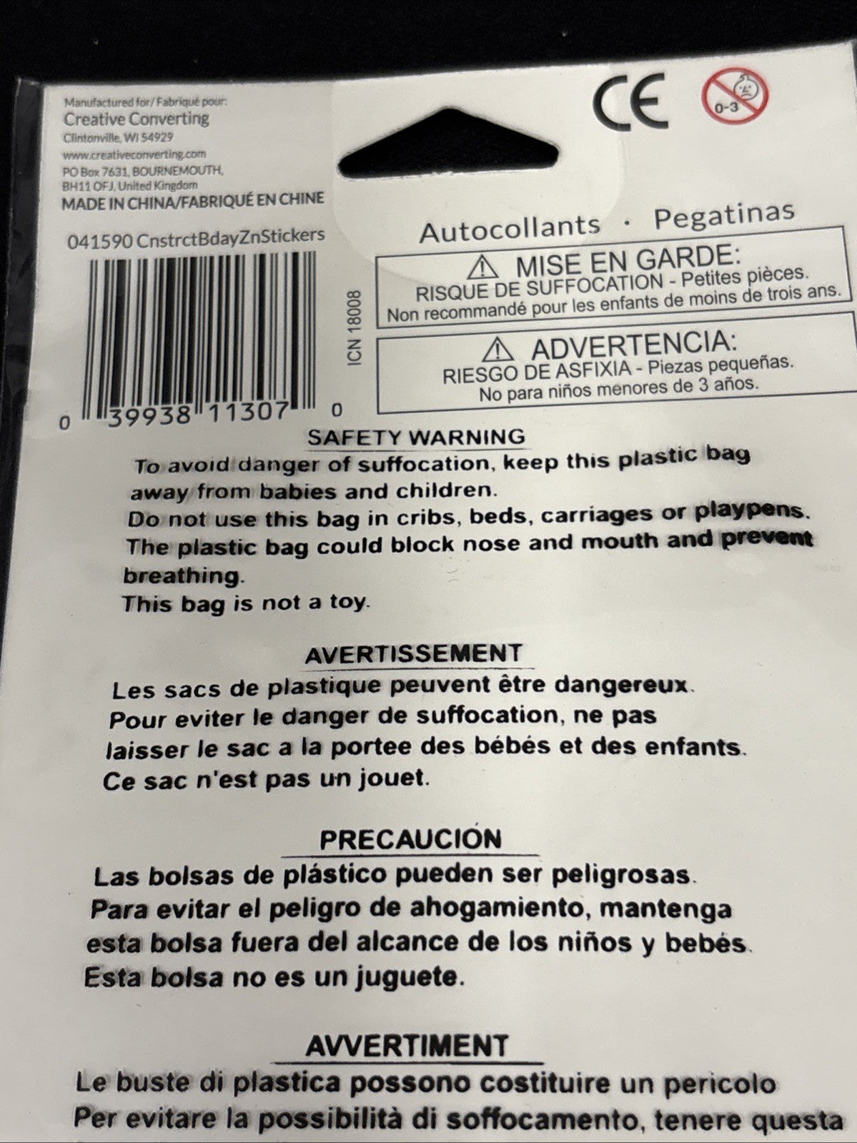 The Construction Zone Value Stickers 4 Sheet Pack is a set of printed stickers featuring a construction theme, perfect for a boy's birthday party. The stickers are yellow in color and come in a traditional style, making them a decorative addition to party favors or bags. Made of sticker material from Creative Converting, these stickers are sure to add a fun touch to any construction-themed celebration.