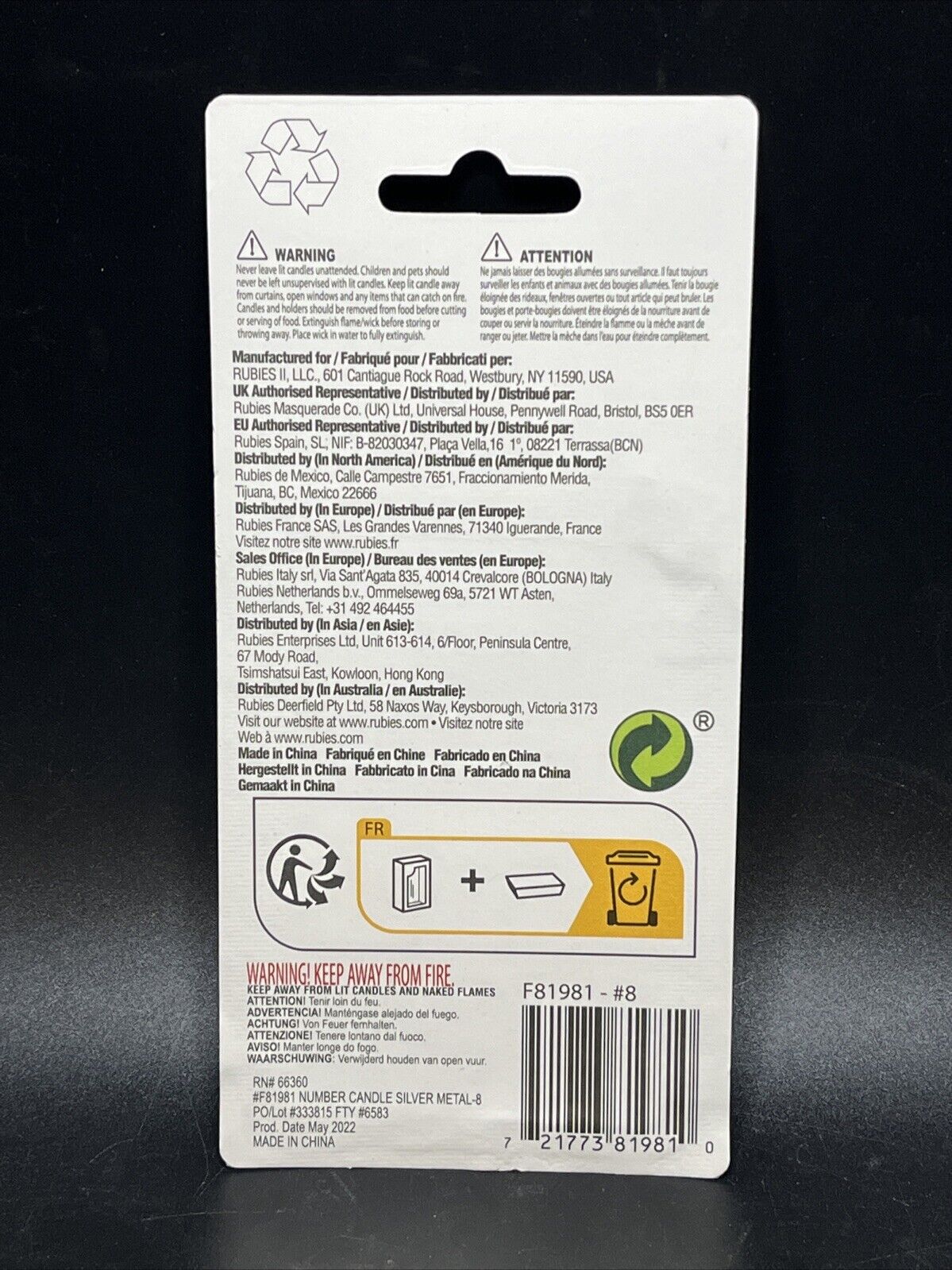 The Forum Metallic Silver Numeral #8 Candle is a 3-inch tall birthday candle decoration in a sleek silver color. This pack includes 8 candles in the shape of the number 8, making it perfect for celebrating someone's 8th birthday in style. The candles are designed to add a festive touch to any birthday cake or dessert, adding a touch of elegance and fun to the celebration.