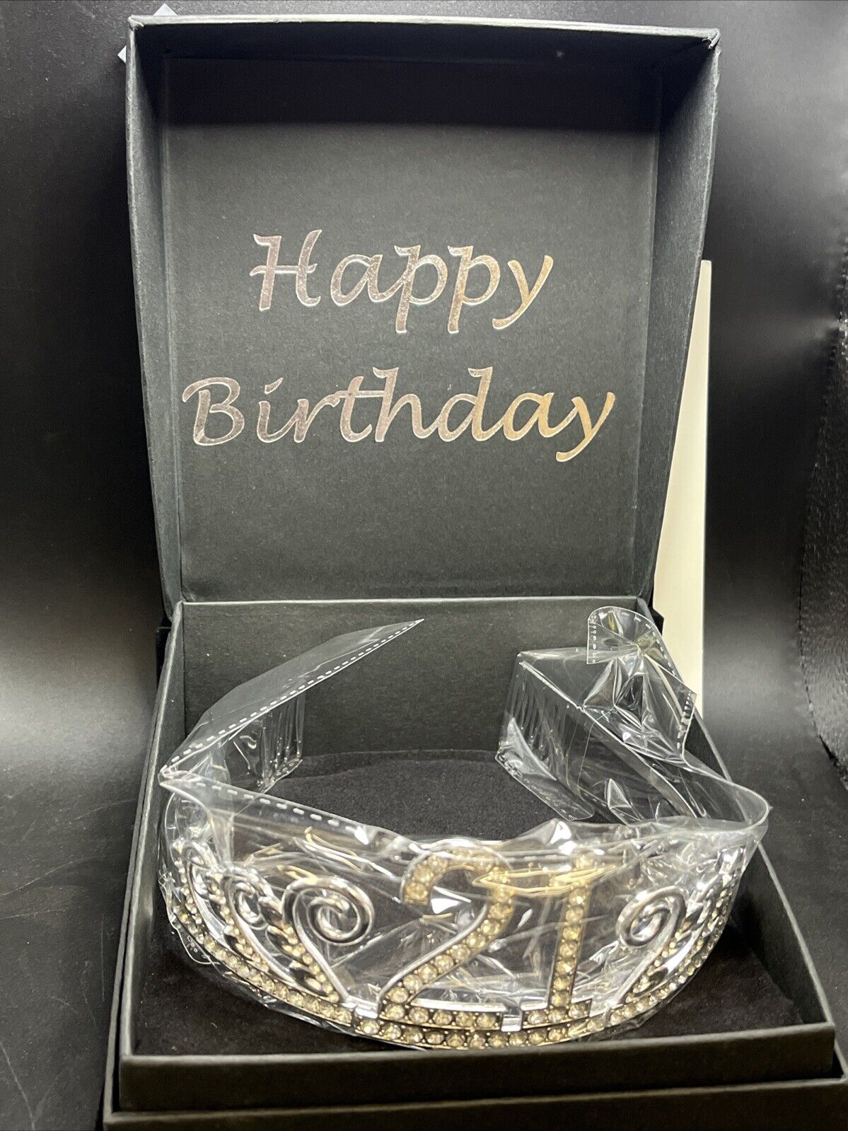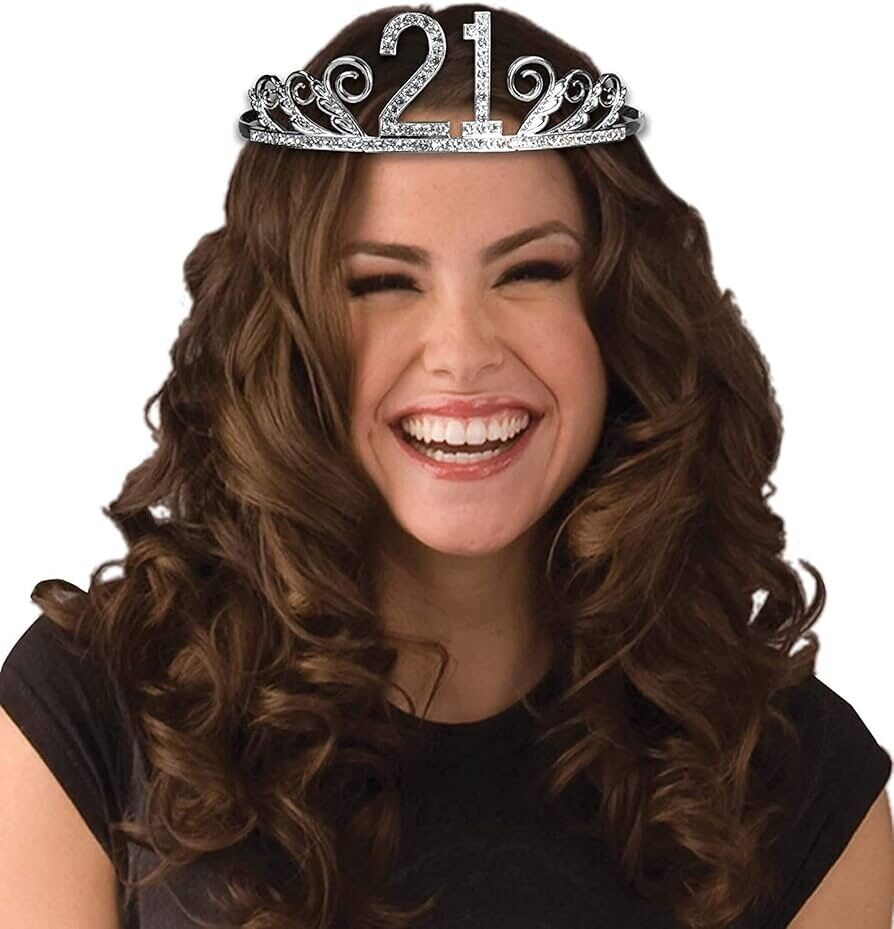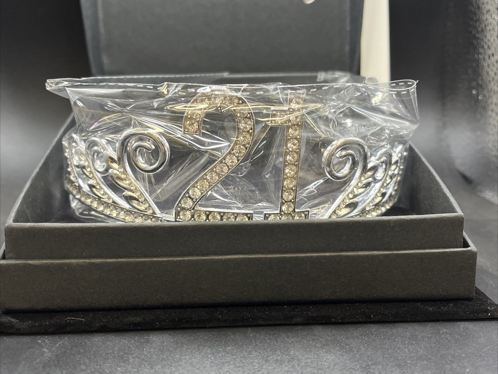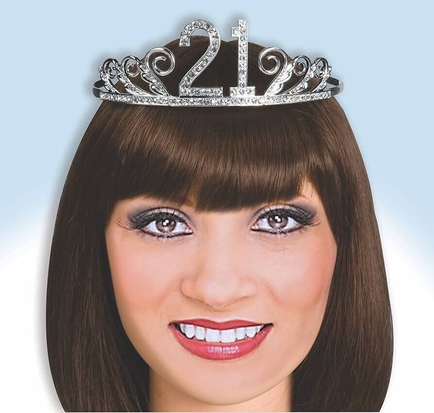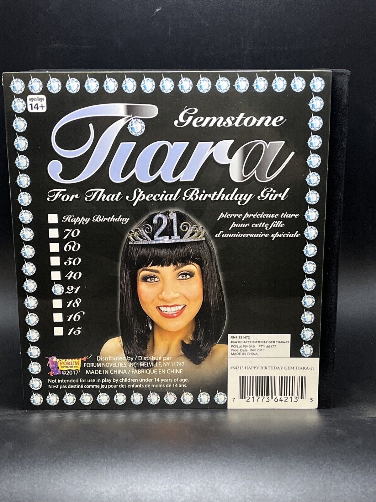 This is a silver tiara by Forum Novelties designed for a 21st birthday celebration. It features gemstone embellishments and is made of plastic. Perfect for women to wear on their special 21st birthday.