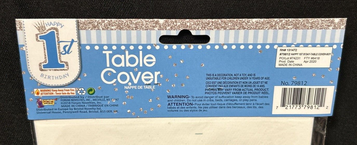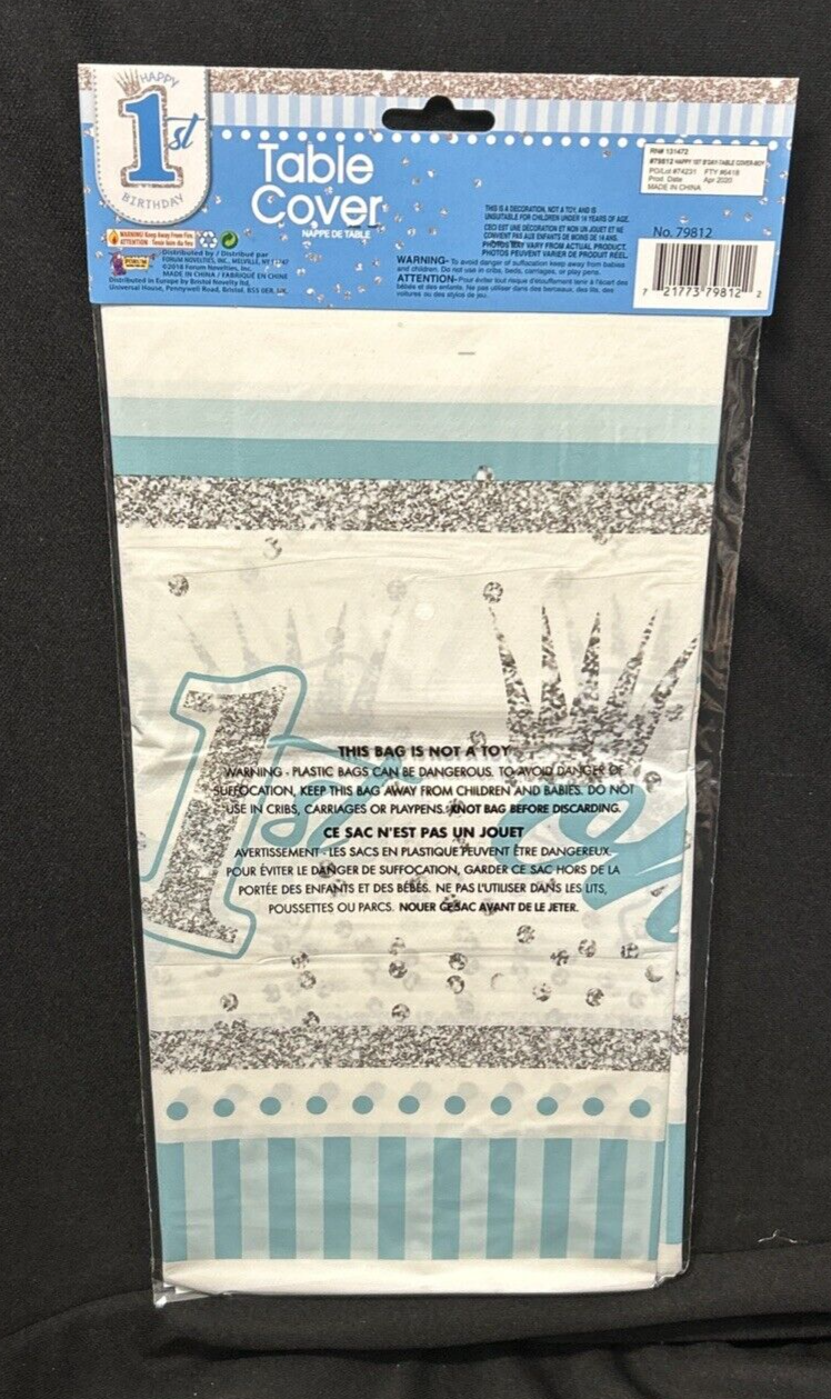This is a blue plastic tablecloth designed for a 1st birthday party for boys. It features a polka dot pattern and is ideal for decorating the party table. The tablecloth is from the brand Forum Novelties and is the perfect addition to the 1st birthday theme. Made in China, this item is a great party supply for celebrating a little boy's special day.