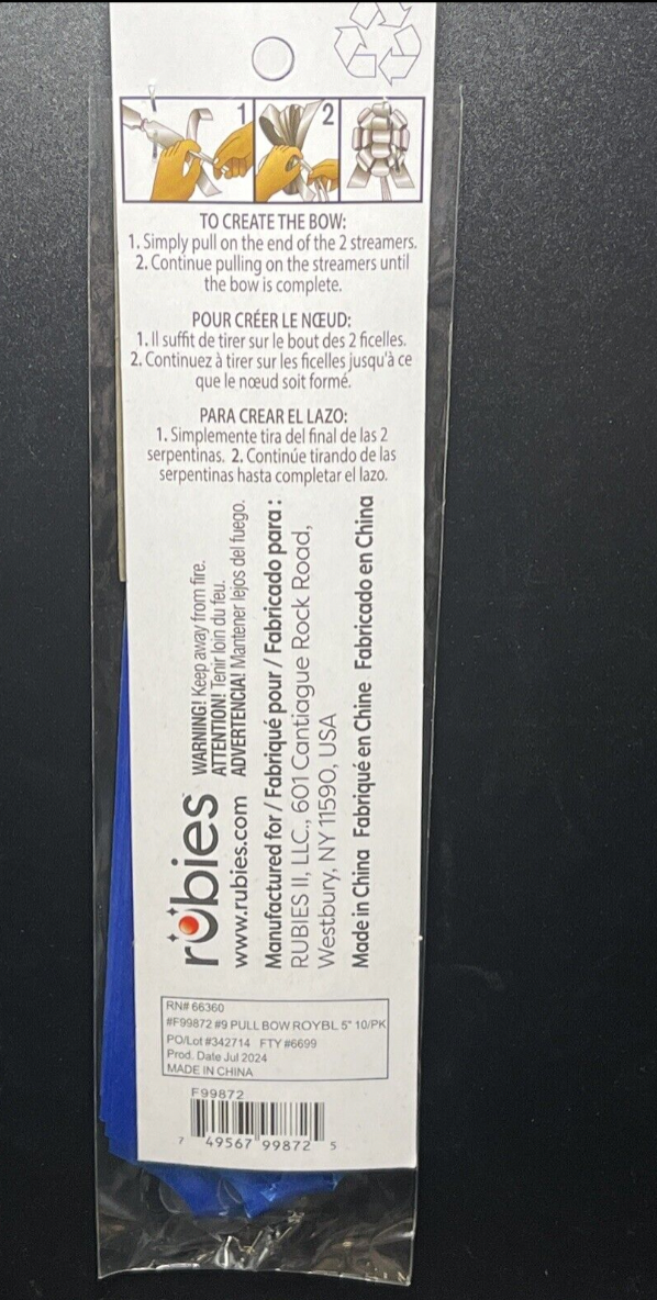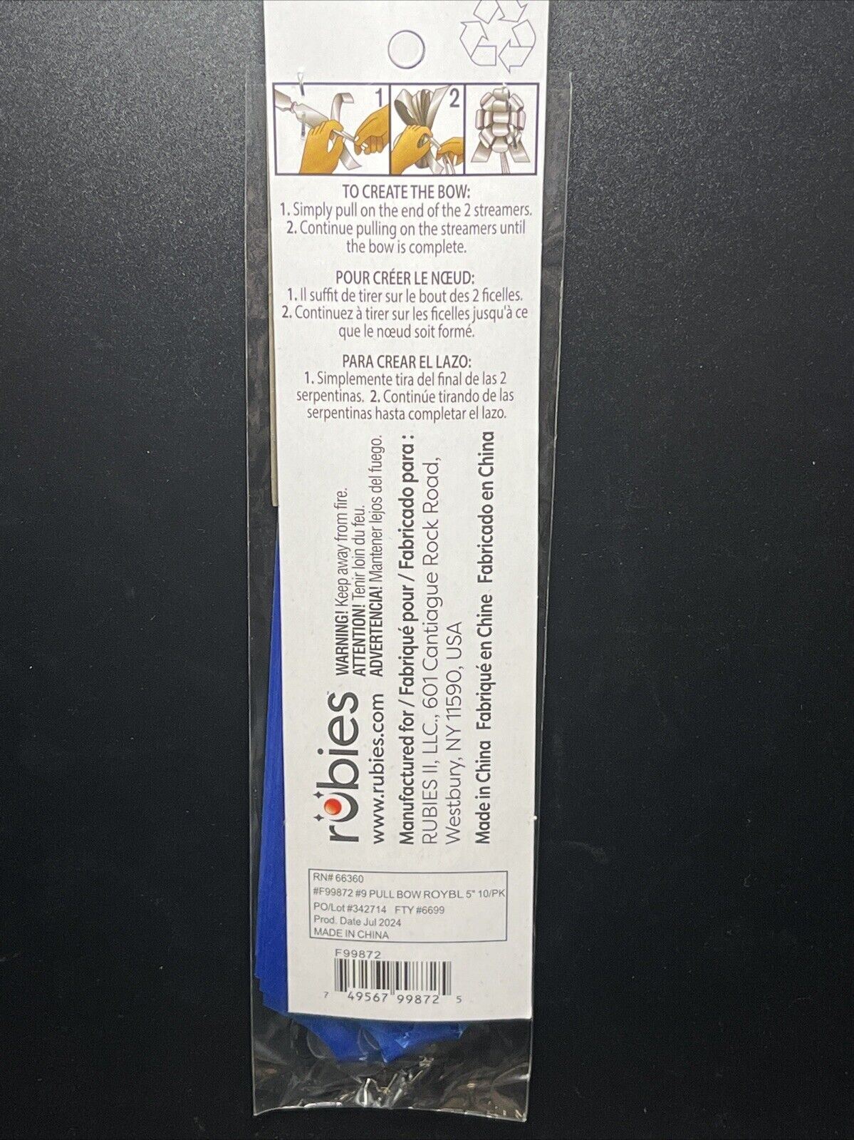 The product is a 5-inch Royal Blue Pull Bow by Rubies, perfect for parties. It comes in a pack of 10 and features a solid pattern. The pull bow is convenient for gift wrapping and adds a decorative touch to presents.