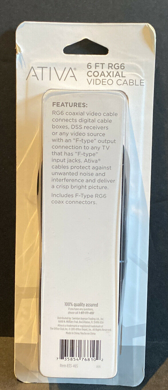 Ativa 833-465 Video Coaxial Cable 6 ft F-TYPE RG6 TV VCR Satellite Para NEW.