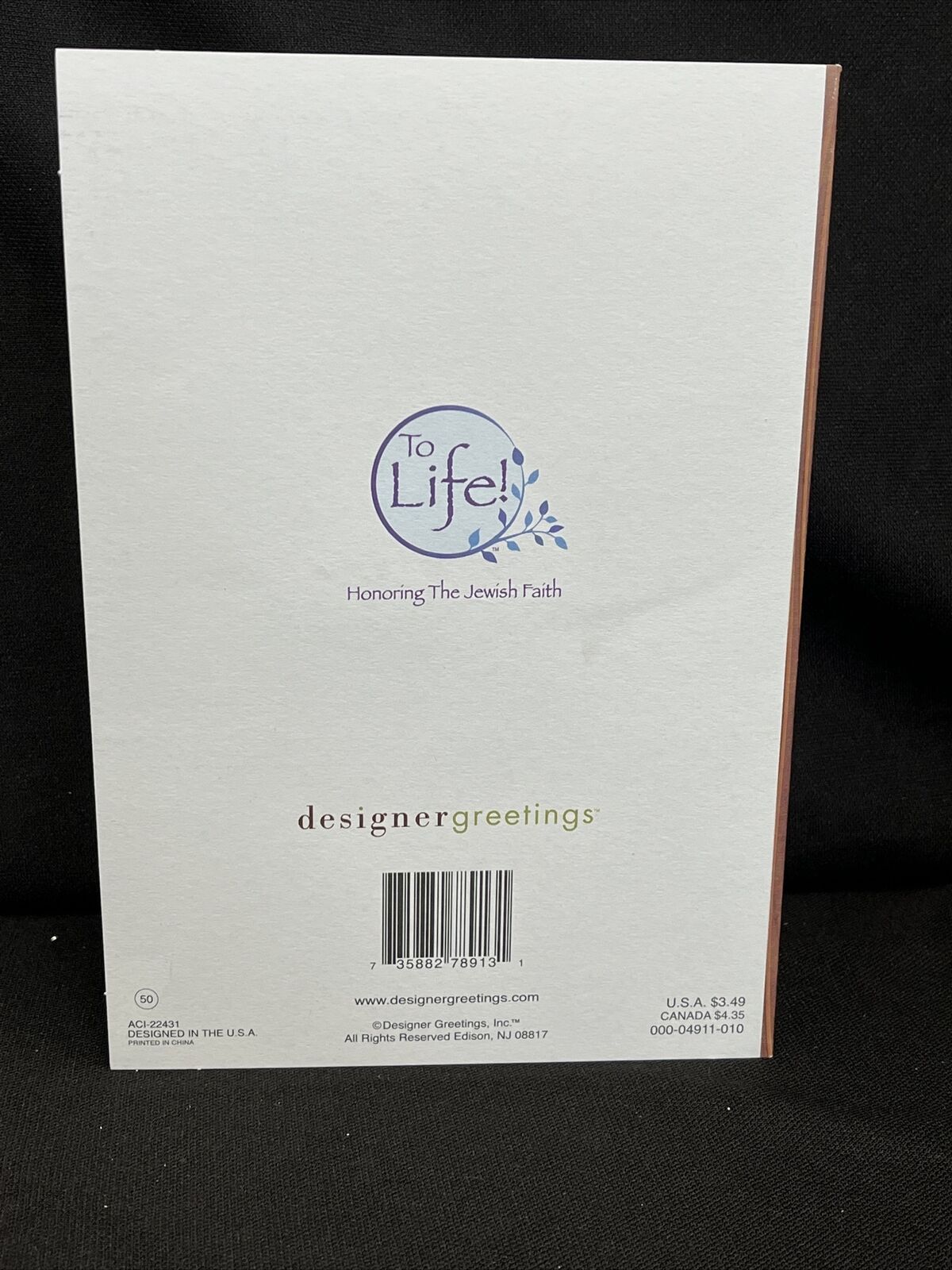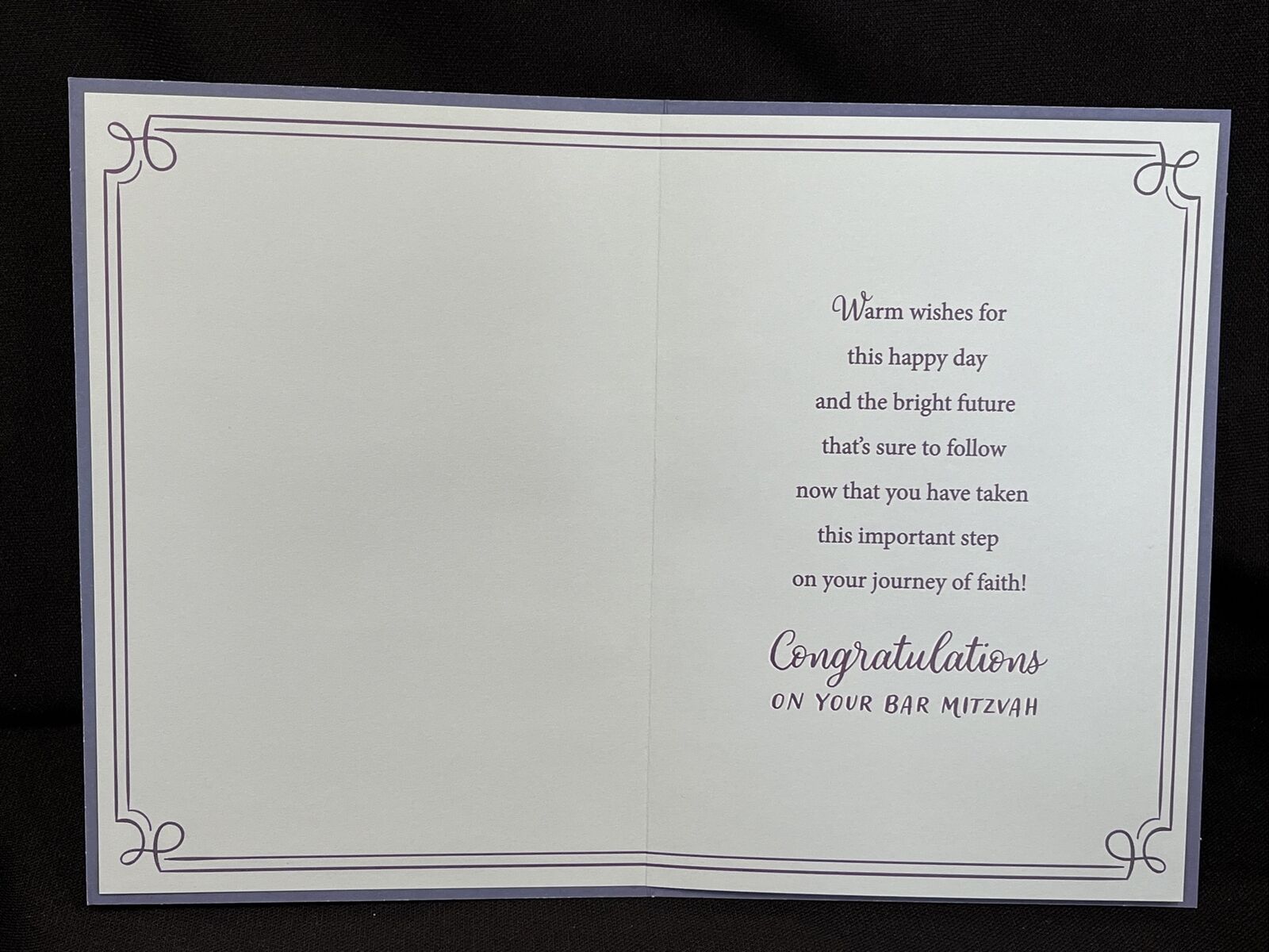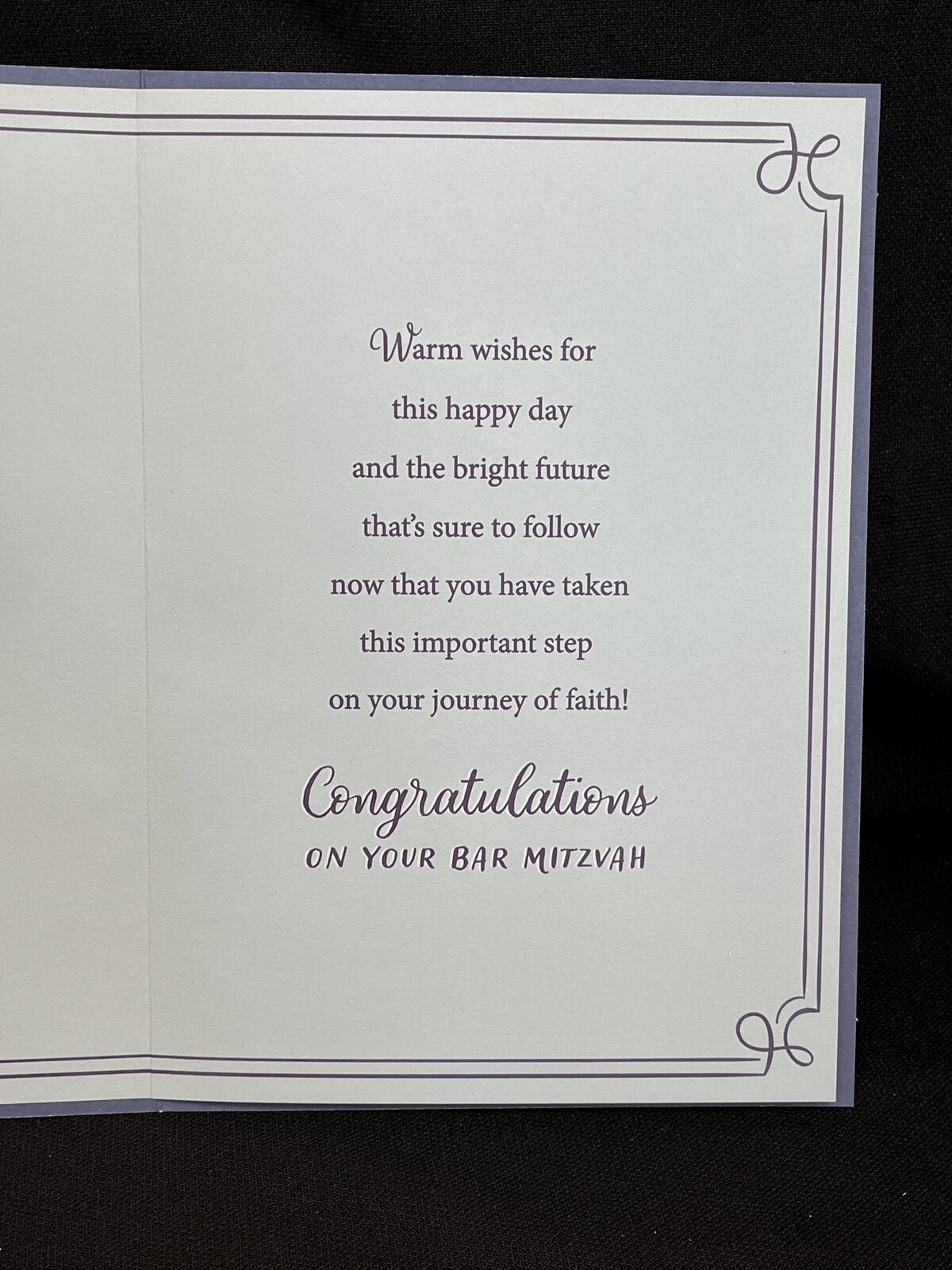 Celebrate the momentous occasion of a Bar Mitzvah with this elegant greeting card! Designed by Designer Greetings, this card is the perfect way to send well wishes to the young man who has reached this important milestone in his life. With a beautiful design and high-quality construction, this greeting card is sure to make a lasting impression.