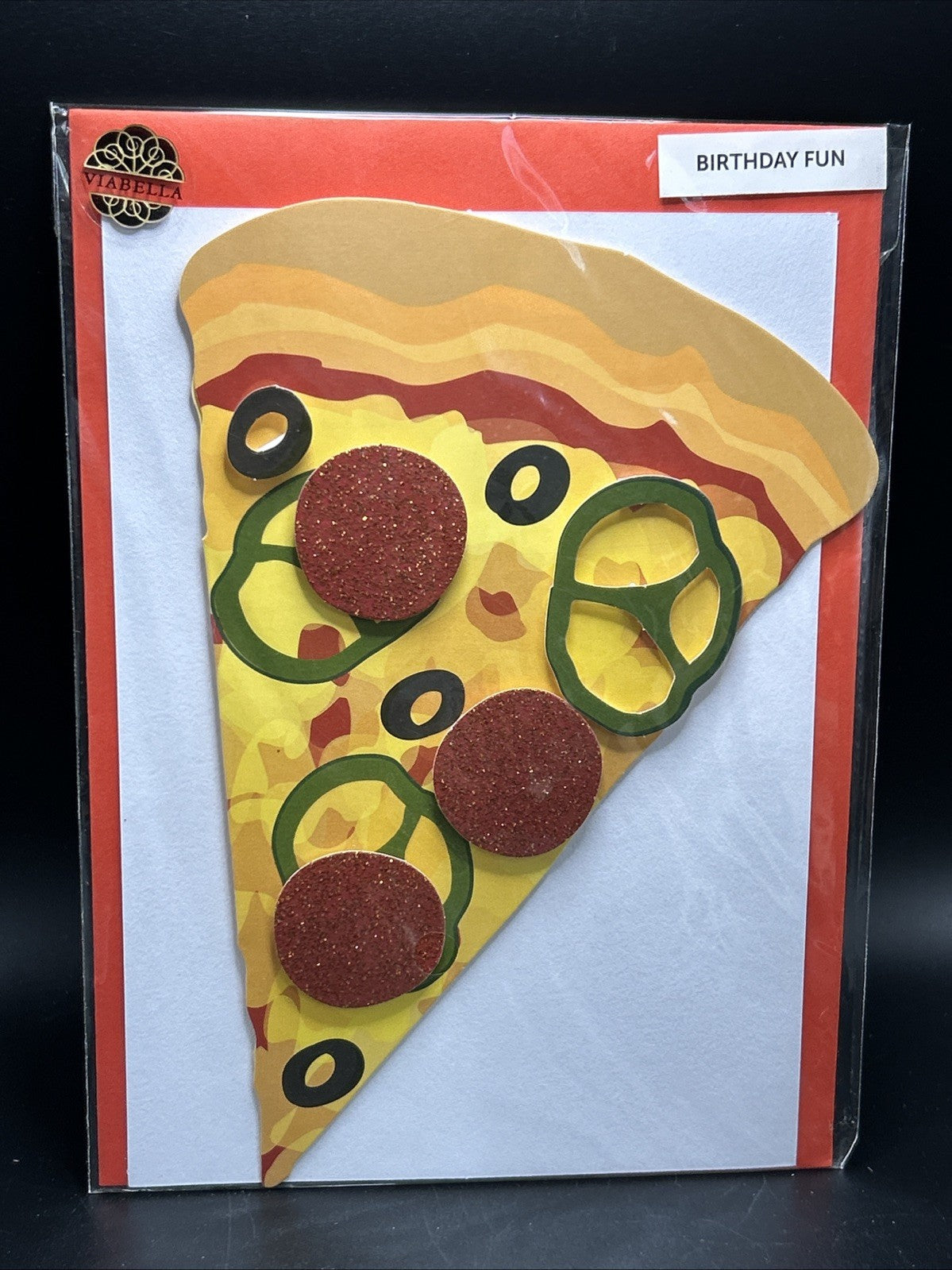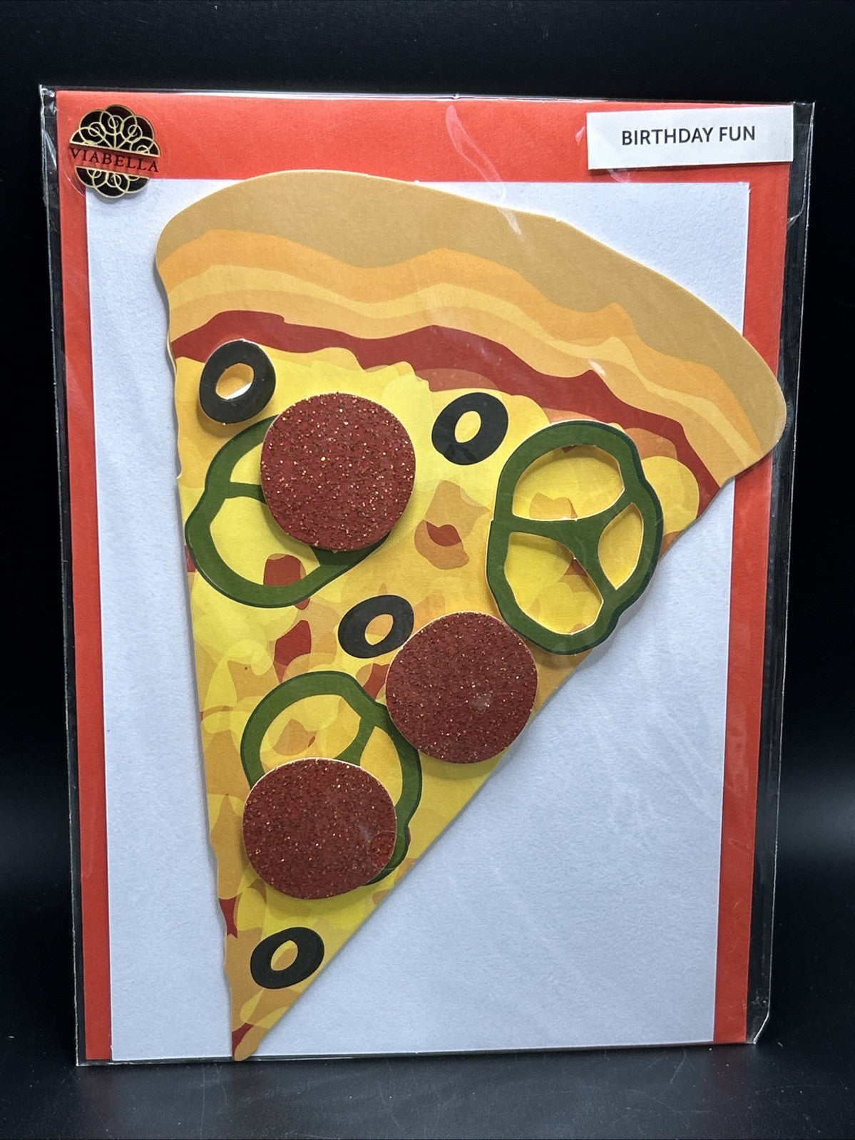 The Birthday Fun Greeting Card by Viabella is a unique and delicious way to celebrate someone's special day. The 3D slice of pizza design adds a playful touch to the card, making it perfect for a birthday occasion. The card comes with an envelope for easy gifting, and the pizza theme adds a fun and lighthearted element to the overall design.