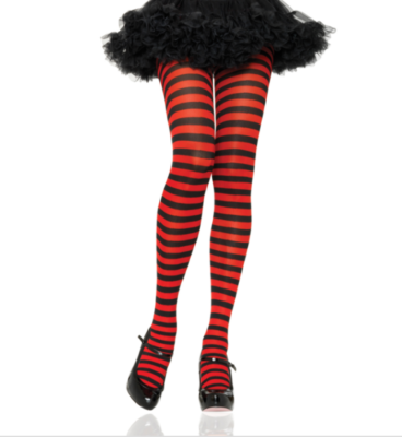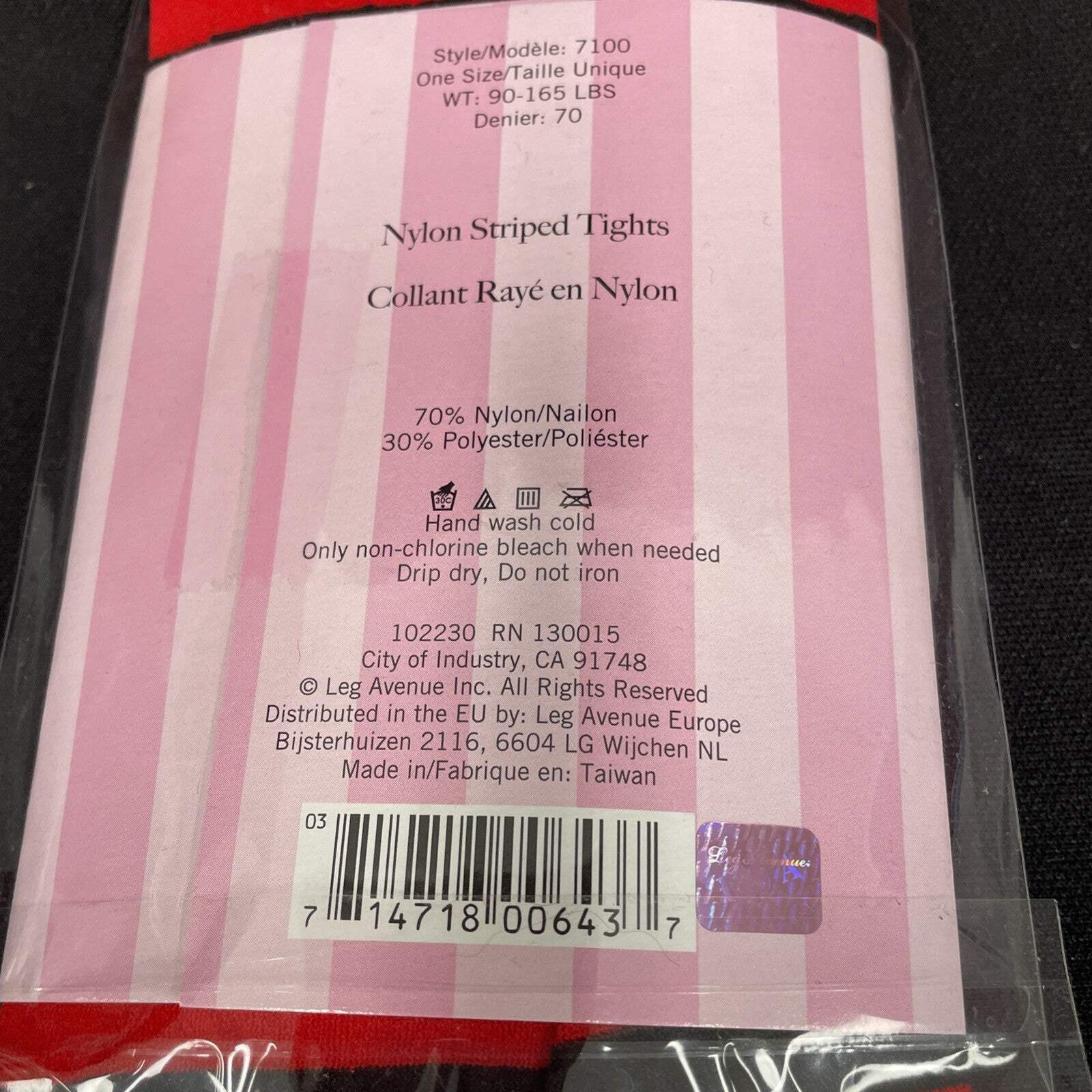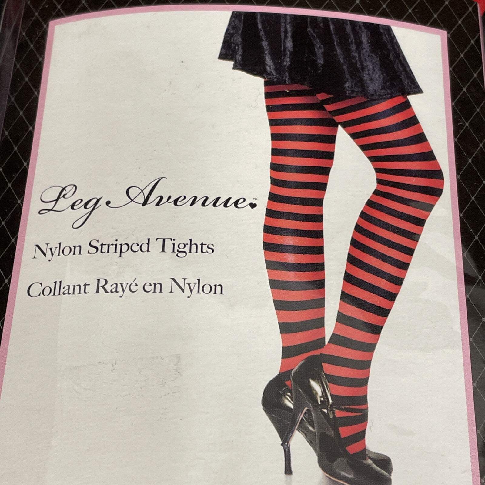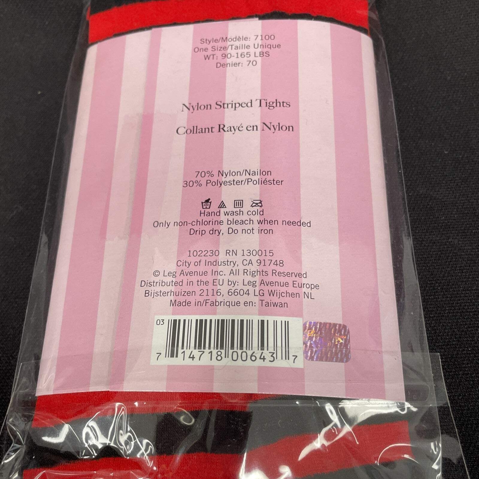 The product is a pair of black and red striped nylon tights by Leg Avenue. Designed for women, this one-size tights are made from nylon and feature a colorful striped pattern. Perfect for adding a pop of color to any outfit, these tights are a stylish and comfortable addition to any adult woman's wardrobe.