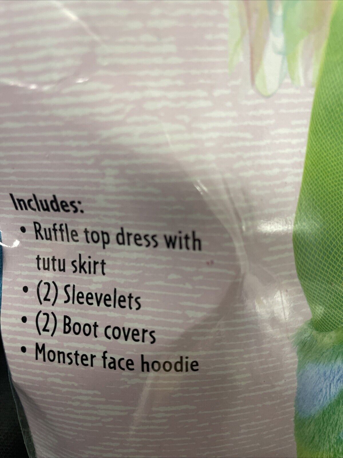 Includes ruffle top dress with tutu skirt, 2 sleevelets, 2 boot covers and monster face hoodie