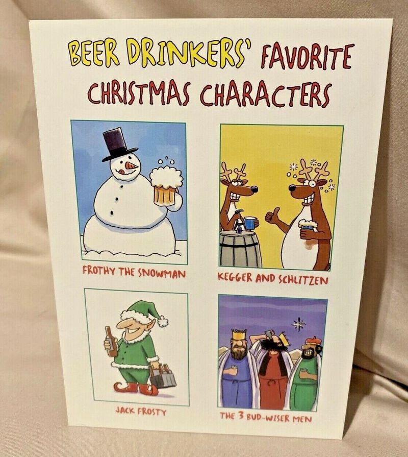 Christmas Greeting Card w/Envelope NEW. Condition is "New". Outside: Beer Drinkers' Favorite Christmas Characters Frothy the Snowman Kegger and Schlitzen Jack Frosty The 3 Bud-Wiser Men Inside: Merry Christmas and Happy Brew Year! NEW Ask about combined shipping on all greeting cards GC670