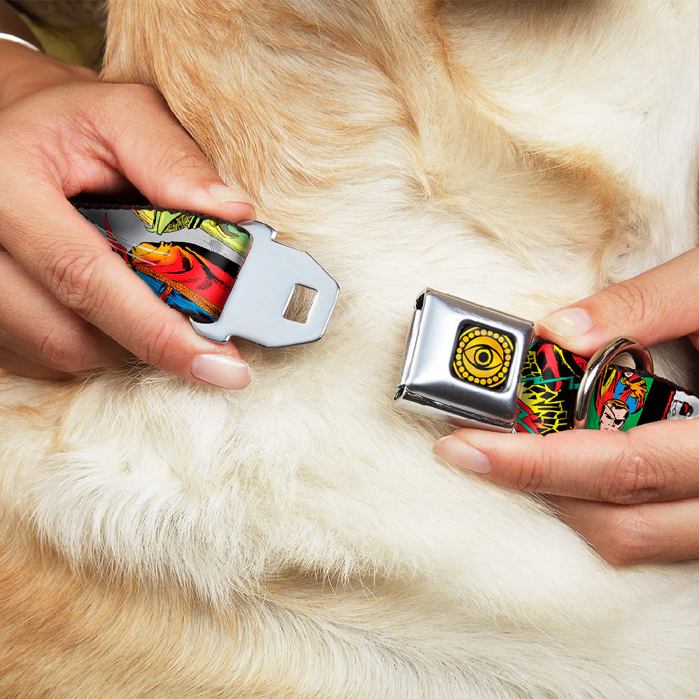 Your dog will be the talk of the town when people notice they're wearing this awesome SeatBelt Dog Collar! Made from high-density polyester and durable steel components, this collar is built to last. It features beautiful vibrant artwork. The buckle is a miniature authentic SeatBelt Buckle, so you press the center button to release the clasp. This product is Made in USA by Buckle-Down Inc. and officially licensed by Marvel Comics.