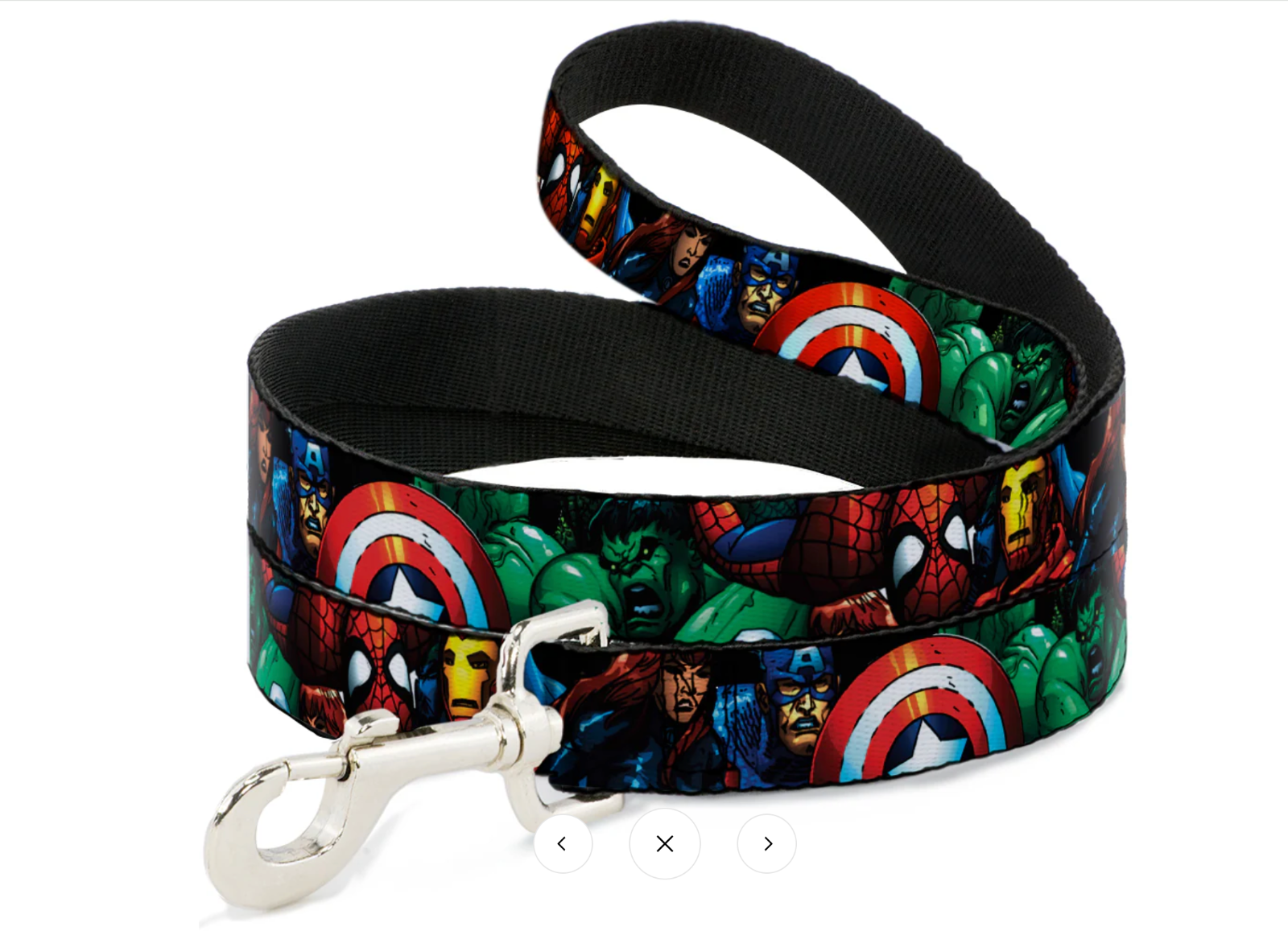 This fashion-forward dog leash is a great way to show off your favorite characters or brands. The durable components and beautiful printing ensure that the colors will continue to pop for years to come! It is made of high-density polyester and steel hardware. This product is Made in the USA by Buckle-Down Inc. and officially licensed by Marvel Comics.