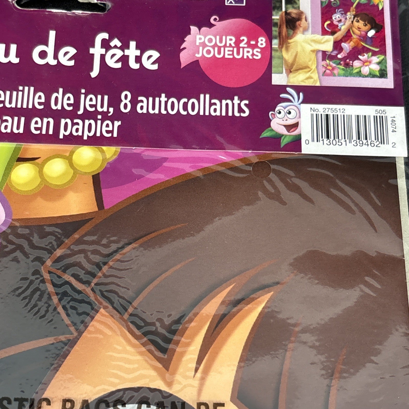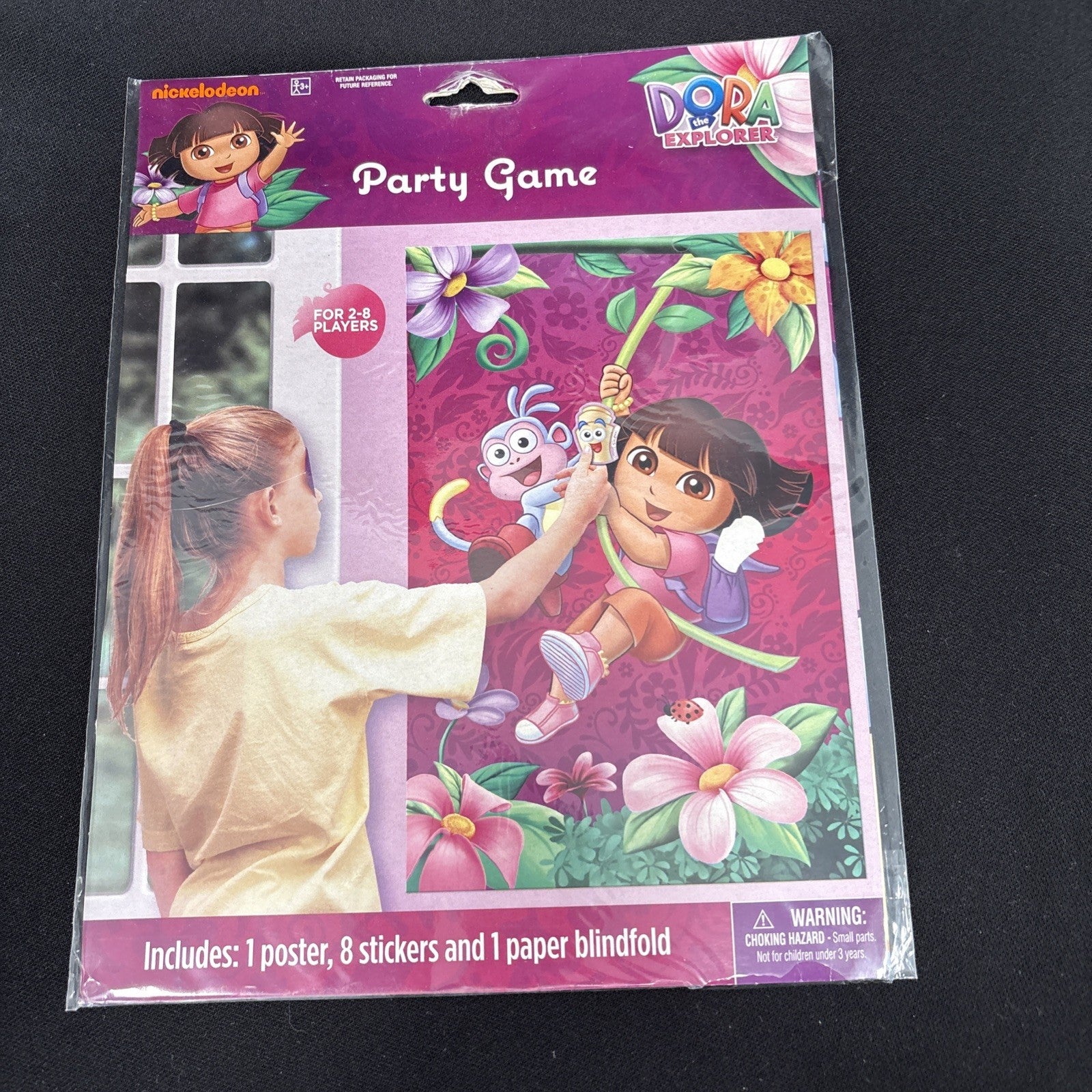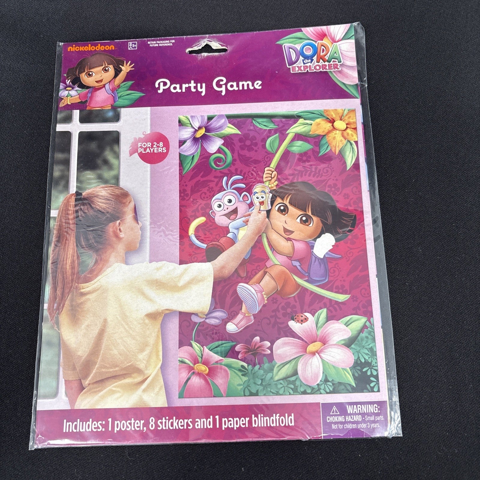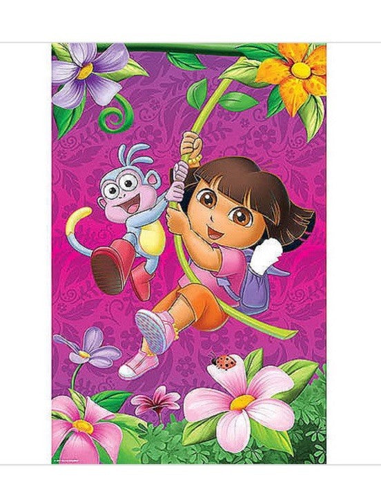 Add some dizzying fun to the party with Dora s Adventure Game Flower. Based on the timeless game Pin the Tail on the Donkey it keeps little party goers giggling and guessing as they are spun around and try to get the map into the backpack. This Dora party game comes with one poster , 8 stickers and 1 paper blindfold.