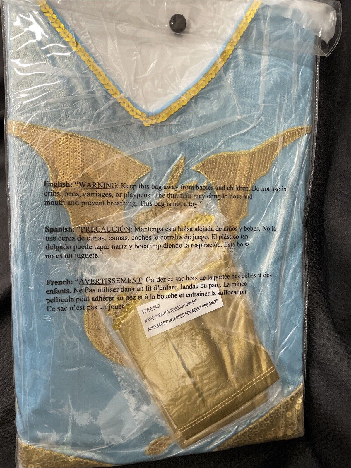 Get ready to take on the Halloween stage with this Dreamgirl Sexy Adult 2pc Dragon Warrior Queen Halloween Costume. Made of 100% polyester, this light blue and gold dress with attached cape and wrist gauntlets is perfect for any adult Halloween occasion. The elastic and stretch features ensure a comfortable fit, while the large size (140-160 recommended) is perfect for a variety of body types.