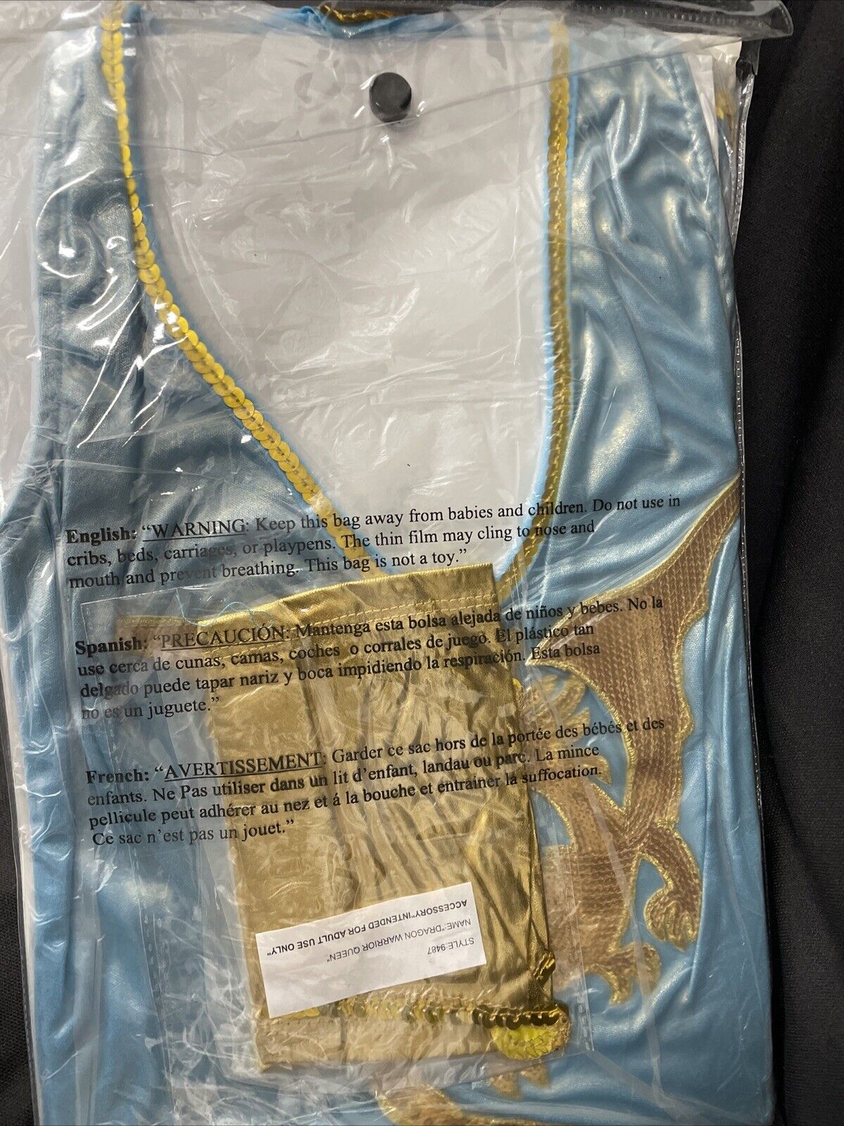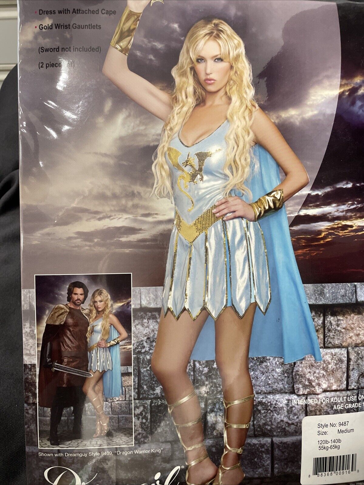 Get ready to take on the Halloween stage with this Dreamgirl Sexy Adult 2pc Dragon Warrior Queen Halloween Costume. Made of 100% polyester, this light blue and gold dress with attached cape and wrist gauntlets is perfect for any adult Halloween occasion. The elastic and stretch features ensure a comfortable fit, while the medium size (120 to 140lbs recommended) is perfect for a variety of body types.