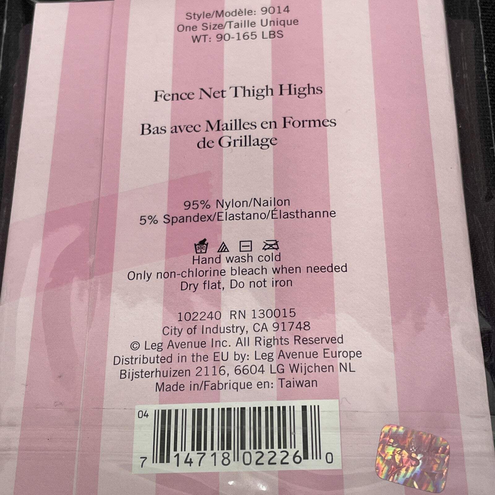 This product is a pair of black thigh-high stockings with a fishnet pattern and band top by Leg Avenue. The stockings are designed to be sexy, with a geometric pattern and a retro fishnet theme, making them suitable for glamour, clubwear, or party occasions. Made of net material and featuring seamless construction, these stockings are perfect for adding a touch of mystery and allure to any outfit. Hand wash only to maintain their quality, these stockings are one size fits most and are ideal for women looking to make a statement with their hosiery.