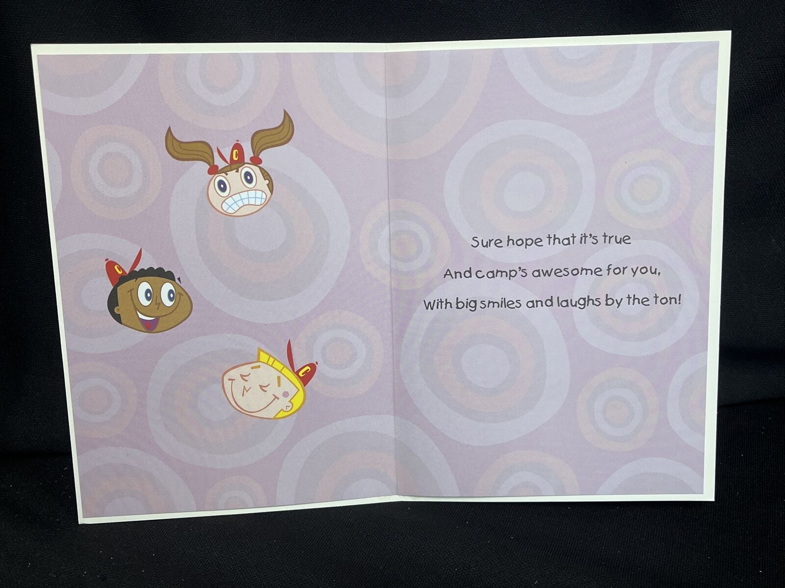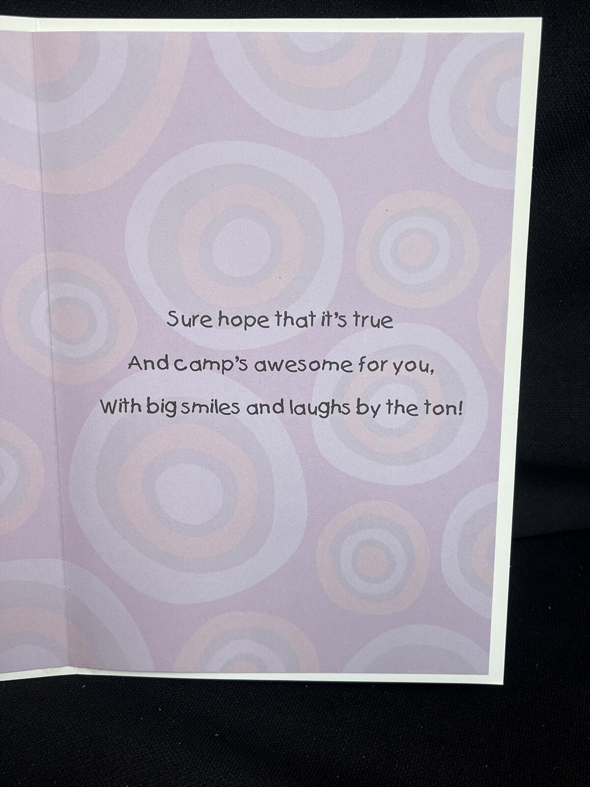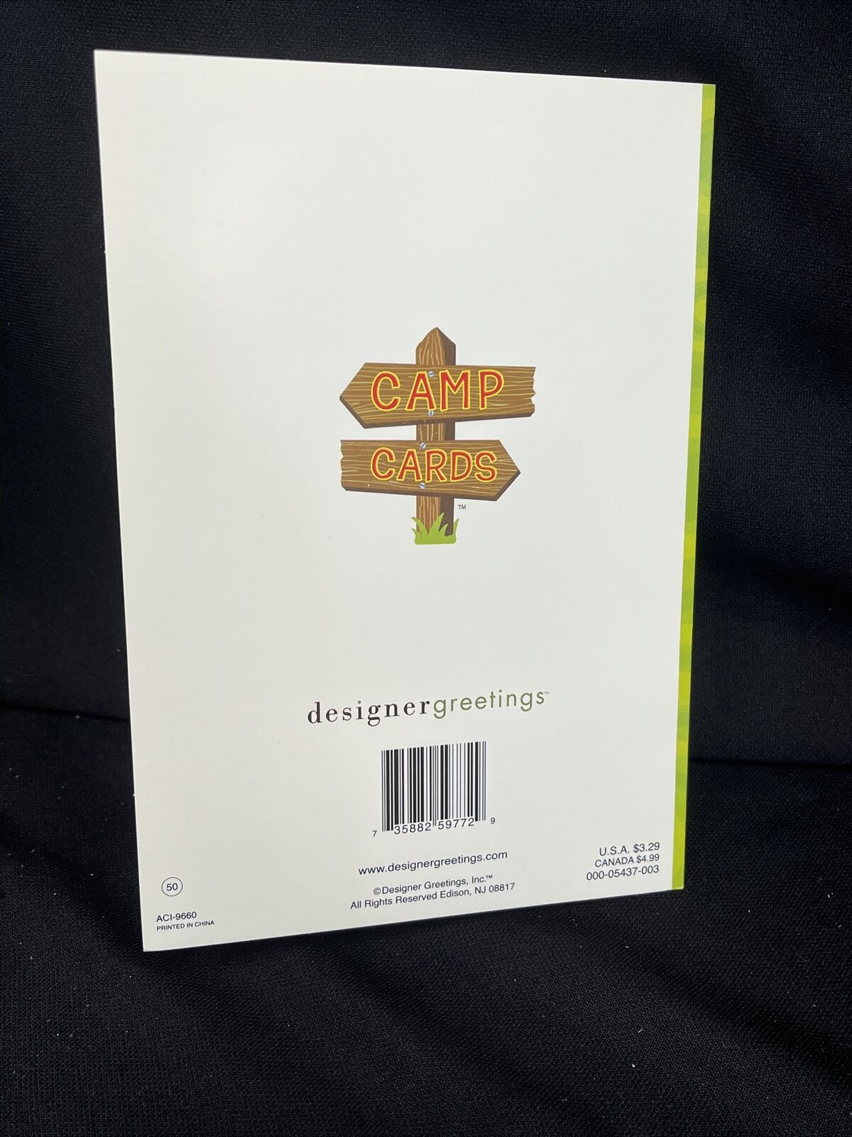 This designer greeting card is the perfect way to welcome a special camper to Camp. The card features a beautiful design that will brighten up anyone's day. With the included envelope, you can easily send this card to the camper or anyone else who deserves a little extra cheer.