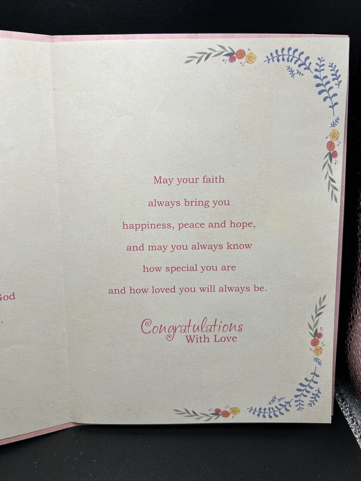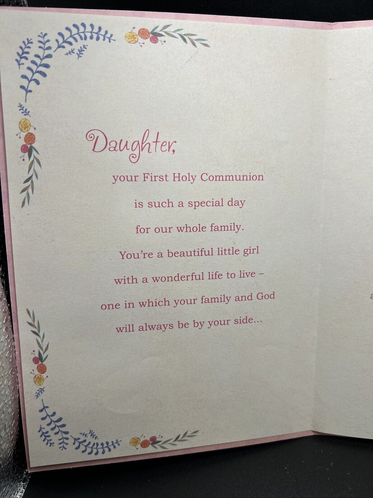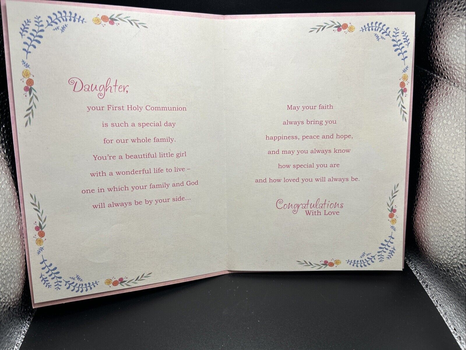 This beautiful greeting card from Designer Greetings is the perfect way to celebrate your daughter's first communion. The card features a stunning design that will make her feel special and appreciated. With an envelope included, you can easily send your message to your beloved child. This card is ideal for anyone who wants to express their love and support for their daughter on this important occasion. Whether you're a parent, grandparent, or anyone who wants to make a positive impact on this young girl's life, this card is sure to bring joy and memories that will last a lifetime.