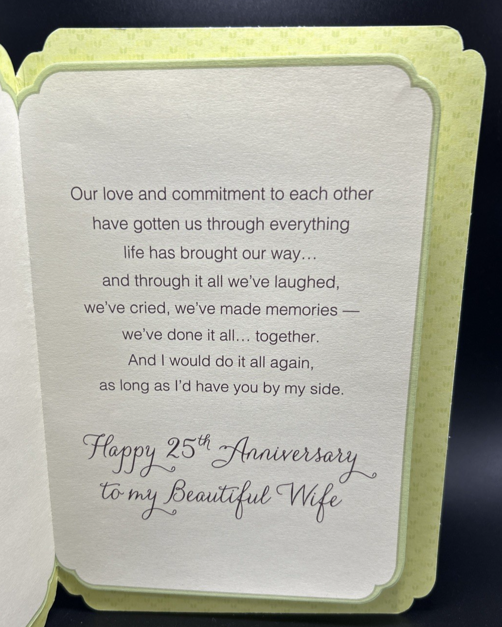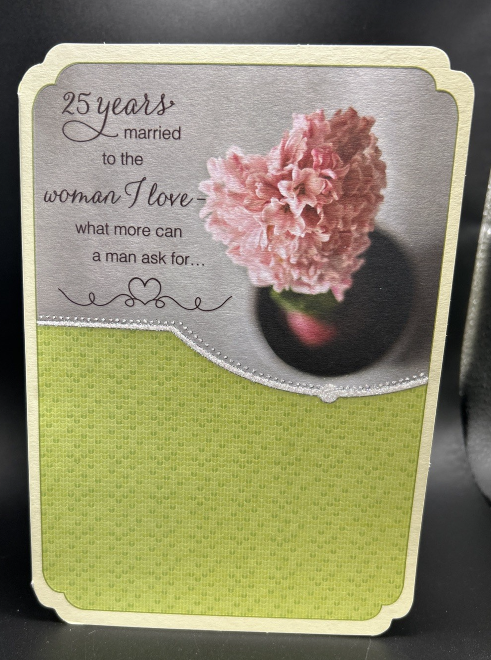 Celebrate your wife's 25th wedding anniversary with this elegant greeting card from Designer Greetings. Designed specifically for women, this anniversary card is the perfect way to show your love and appreciation. The card comes with an envelope for easy gifting, making it a thoughtful and meaningful way to commemorate this special milestone in your relationship.