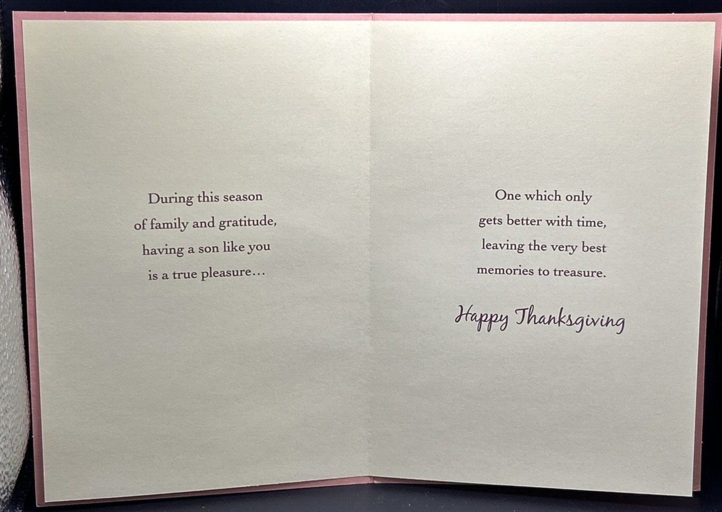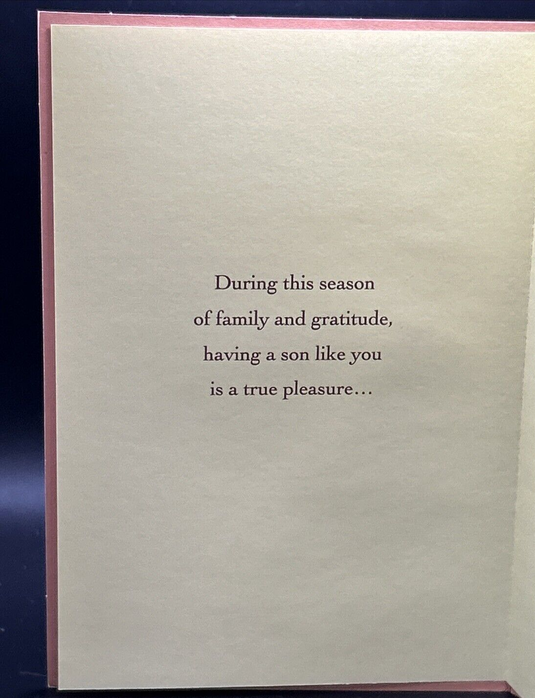 The card is ideal for anyone who loves to express their feelings through beautiful designs and thoughtful gestures. It is perfect for a wide range of occasions, including Thanksgiving, birthdays, and anniversaries. So why wait? Get your hands on this stunning greeting card today and let your son know how much you care!