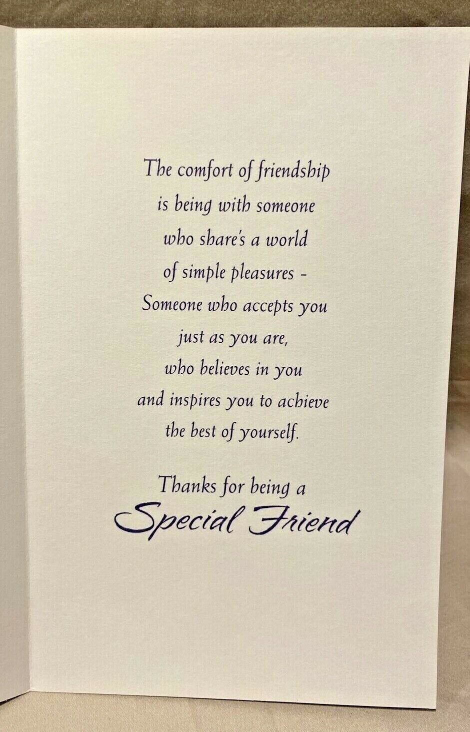 Friendship Greeting Card w/Envelope NEW. Condition is "New". Outside: Friendship Is Special It feels warm and comfortable It feels close and caring It feels joyful and inspiring It feels as natural as a smile Inside: The comfort of friendship is being with someone who share's a world of simple pleasures- Someone who accepts you just as you are, who believes in you and inspires you to achieve the best of yourself. Thanks for being a Special Friend NEW Ask about combined shipping on all greeting cards GC988