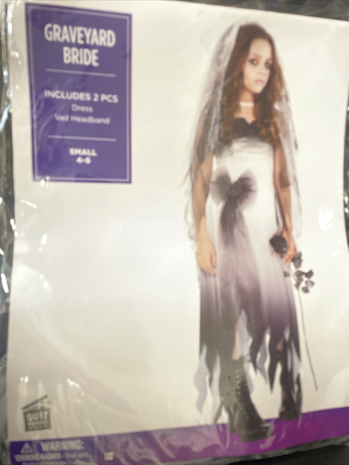 Get ready for Halloween with this Graveyard Bride costume for girls in size small (4-6). Amscan has created a spooky and fun costume that is perfect for any young girl who wants to dress up and stand out. The costume features a white dress with black accents, a hooded cape, and a pair of gloves.