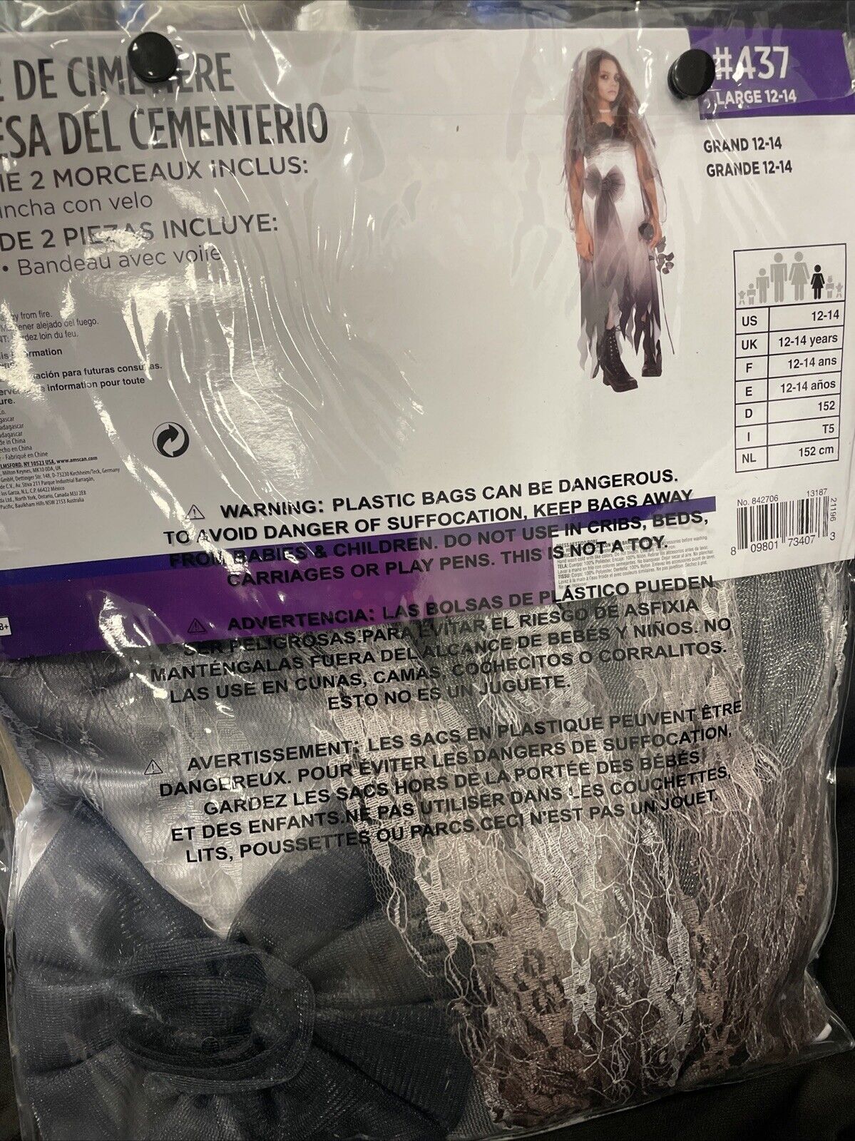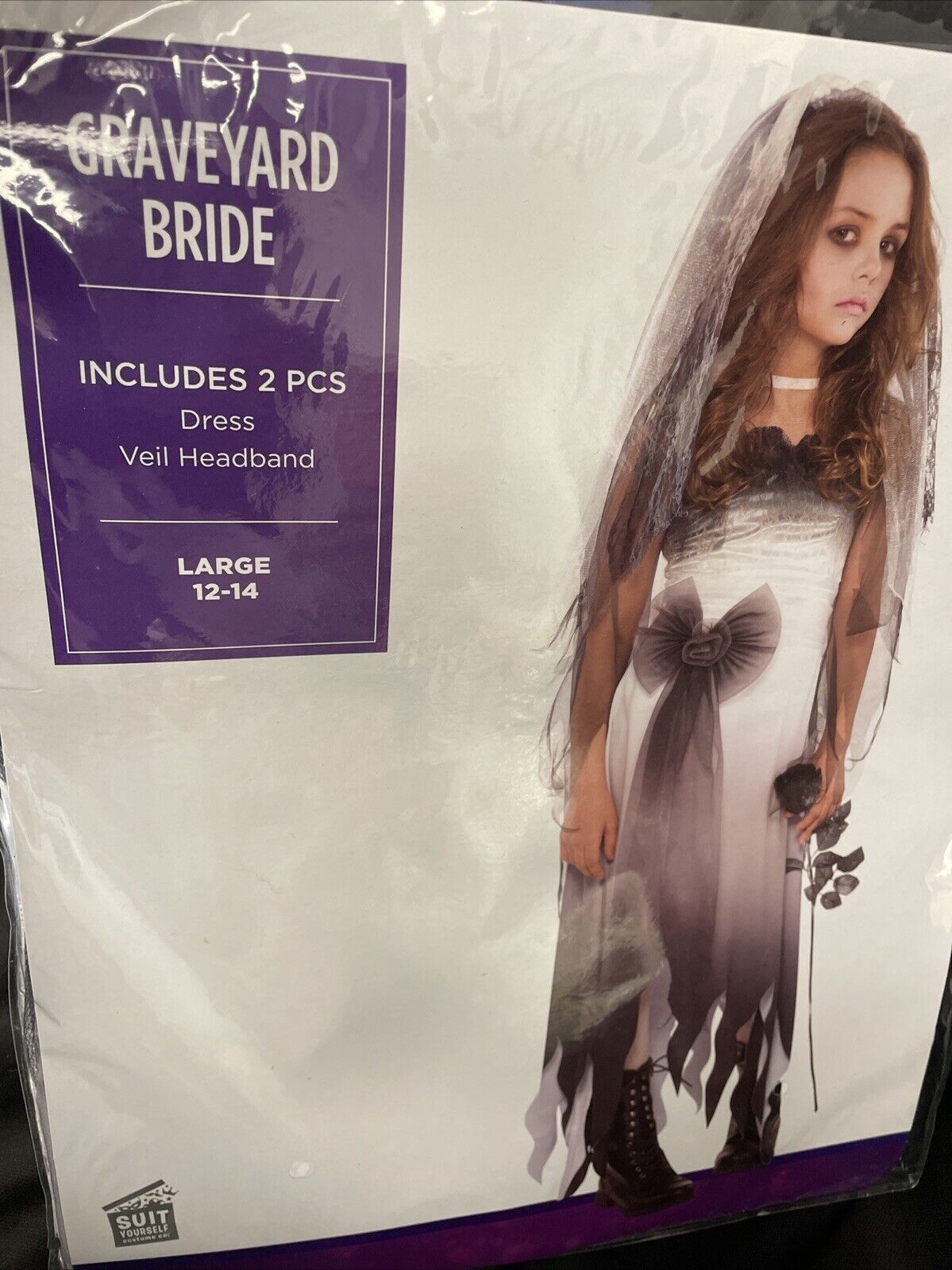 Get ready for Halloween with this stunning Graveyard Bride Halloween Costume. This dress and veil set is perfect for any child size Large (12-14) and is sure to make a statement at any Halloween event. The dress features a spooky graveyard theme includes dress and veil headband