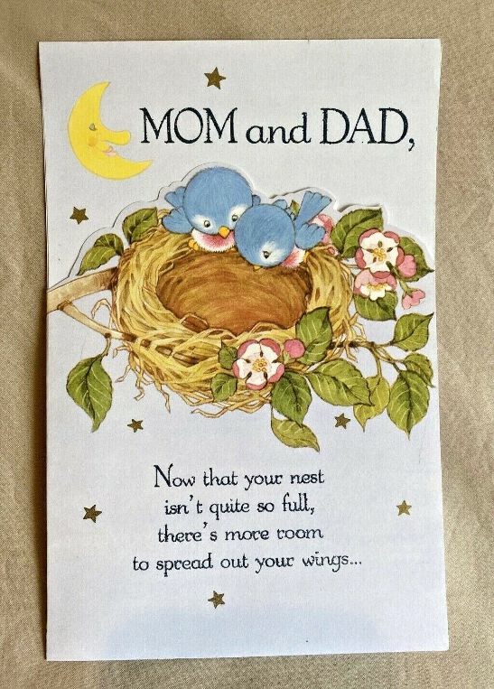 Happy Anniversary Mom And Dad Greeting Card w/Envelope NEW. Condition is "New". Outside: Mom and Dad Now that your nest isn't quite so full, there's more room to spread out your wings... Inside: ...and wrap them around each other! Happy Anniversary! Enjoy Yourselves! NEW Ask about combined shipping on all greeting cards GC723