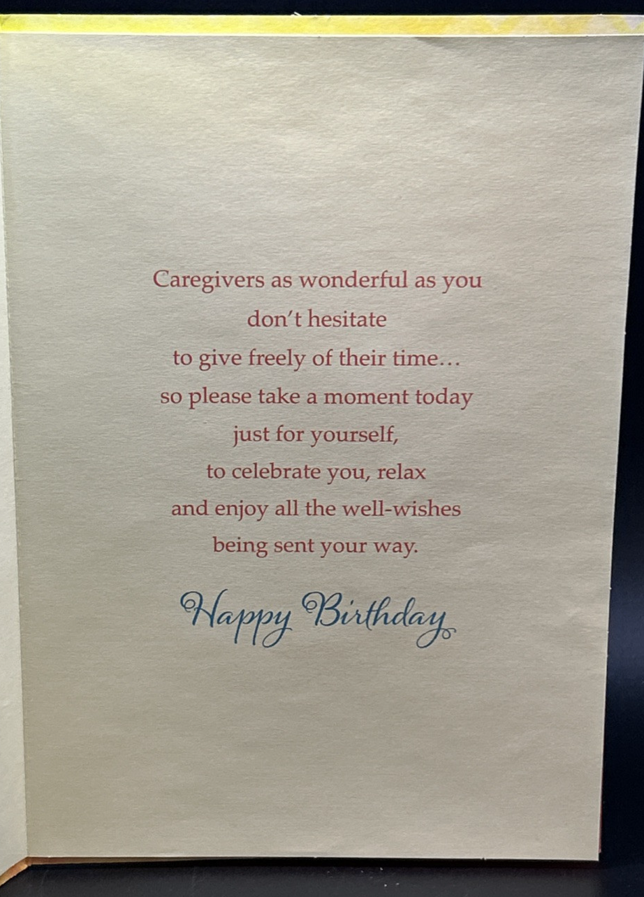 Crafted by Designer Greetings, this heartfelt Happy Birthday card is an ideal way to show appreciation to your caregiver. It features a beautifully designed exterior, coupled with a warm, personalized message inside that's perfect for celebrating this important relationship.