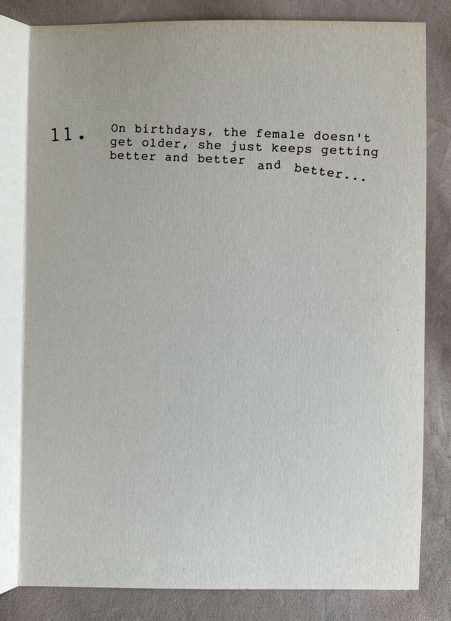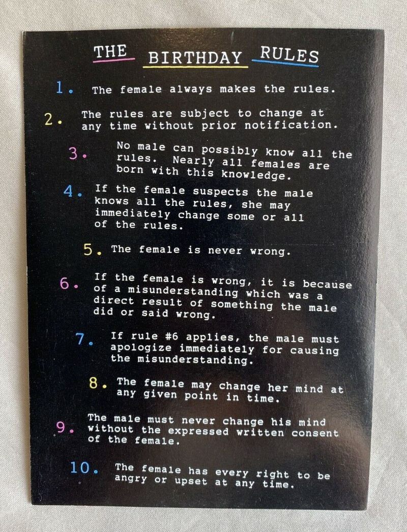 Happy Birthday Greeting Card w/Envelope NEW. Condition is "New". Outside: The Birthday Rules 1. The female always makes the rules. 2. The rules are subject to change at any time without prior notification. 3. No male can possibly know all the rules. Nearly all females are born with this knowledge. 4. If the female suspects the males knows all the rules, she may immediately change some or all of the rules. 5. The female is never wrong. 6. If the female is wrong, it is because of a misunderstanding which was a direct result of something the male did or said wrong. 7. If rule #6 applies, the male must apologize immediately for causing the misunderstanding. 8. The female may change her mind at any given point in time. 9. The male must never change his mind without the expressed written content of the female. 10. The female has every right to be angry or upset at any time. Inside: 11. On birthdays, the female doesn't get older, she just keeps getting better and better and better... NEW Ask about combined shipping on all greeting cards GC731