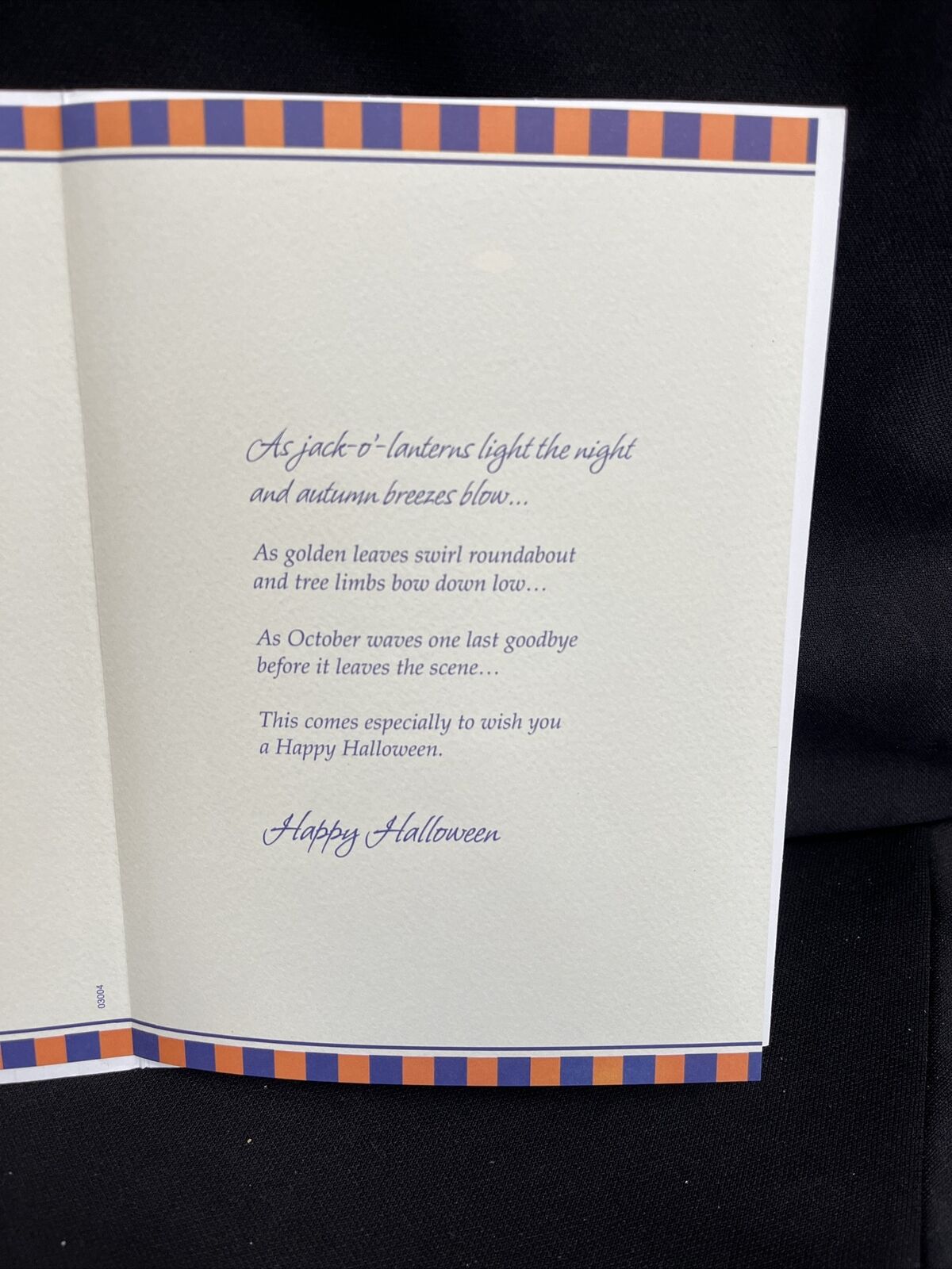 This designer greetings card is the perfect choice for Halloween and autumn celebrations. The card features a cheerful greeting and is ideal for sending to your aunt or uncle. The card comes with an envelope, making it easy to send to the recipient. . The type of the card is a greeting card, and the brand is Designer Greetings. The recipient of the card is an aunt or uncle. Wish them a happy Halloween and autumn with this delightful card.