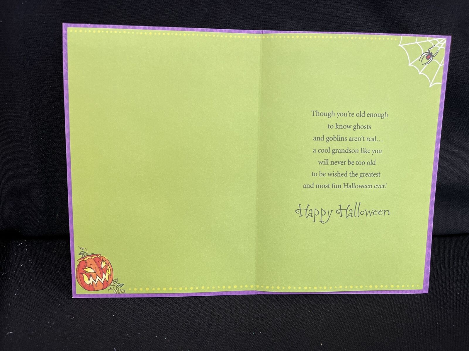 Get ready to celebrate Halloween with this delightful greeting card from Designer Greetings. The card is perfect for any occasion and features a spooky design that will make your grandson smile. Included in the card is an envelope, making it easy to send to your grandson's house.